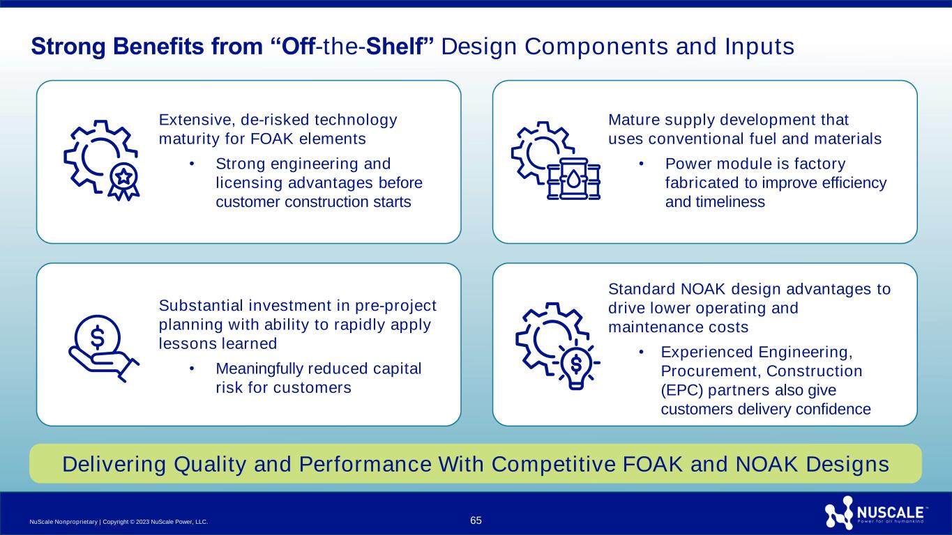 64NuScale Nonproprietary | Copyright © 2023 NuScale Power, LLC. Progress to Date and Operational Priorities Going Forward Clear Initiatives to Support Business Growth and Manufacturing Efficiency • Unmatched development and readiness for SMR deployment • Industry-leading certification and progress with regulators • Well-positioned to develop scalable, flexible, standardized plant design Accelerating First-of-a-Kind (FOAK) module advantages from established fuel source and supply chain ecosystem Deploying manufacturing trials and other key learnings and tools to ensure confidence in delivery plan Expanding capabilities to deliver best-in- class NOAK module Progress to Date Operational Priorities Enabling Business Development and NPM Delivery
