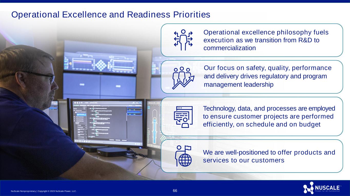 66NuScale Nonproprietary | Copyright © 2023 NuScale Power, LLC. Operational Excellence and Readiness Priorities Our focus on safety, quality, performance and delivery drives regulatory and program management leadership Technology, data, and processes are employed to ensure customer projects are performed efficiently, on schedule and on budget We are well-positioned to offer products and services to our customers Operational excellence philosophy fuels execution as we transition from R&D to commercialization