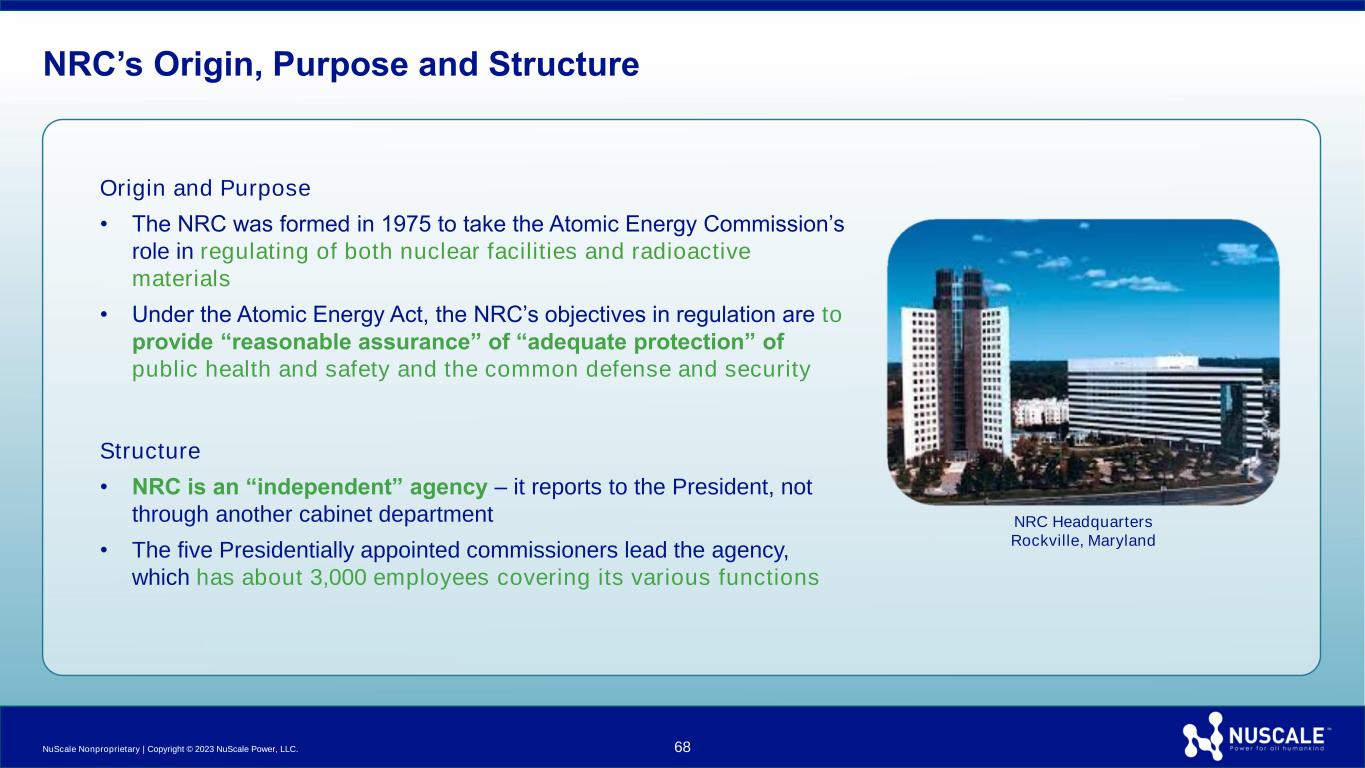 68NuScale Nonproprietary | Copyright © 2023 NuScale Power, LLC. Origin and Purpose • The NRC was formed in 1975 to take the Atomic Energy Commission’s role in regulating of both nuclear facilities and radioactive materials • Under the Atomic Energy Act, the NRC’s objectives in regulation are to provide “reasonable assurance” of “adequate protection” of public health and safety and the common defense and security Structure • NRC is an “independent” agency – it reports to the President, not through another cabinet department • The five Presidentially appointed commissioners lead the agency, which has about 3,000 employees covering its various functions NRC’s Origin, Purpose and Structure NRC Headquarters Rockville, Maryland
