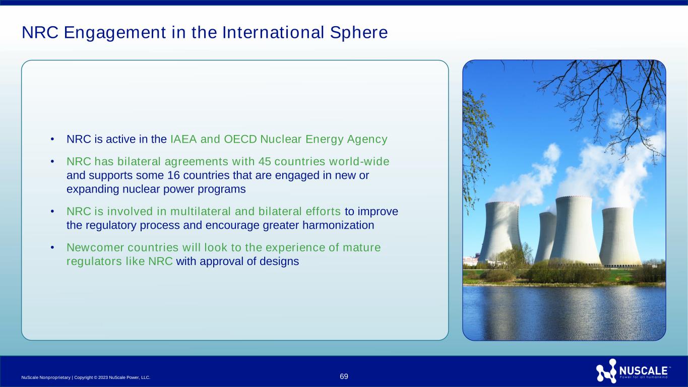 69NuScale Nonproprietary | Copyright © 2023 NuScale Power, LLC. NRC Engagement in the International Sphere • NRC is active in the IAEA and OECD Nuclear Energy Agency • NRC has bilateral agreements with 45 countries world-wide and supports some 16 countries that are engaged in new or expanding nuclear power programs • NRC is involved in multilateral and bilateral efforts to improve the regulatory process and encourage greater harmonization • Newcomer countries will look to the experience of mature regulators like NRC with approval of designs