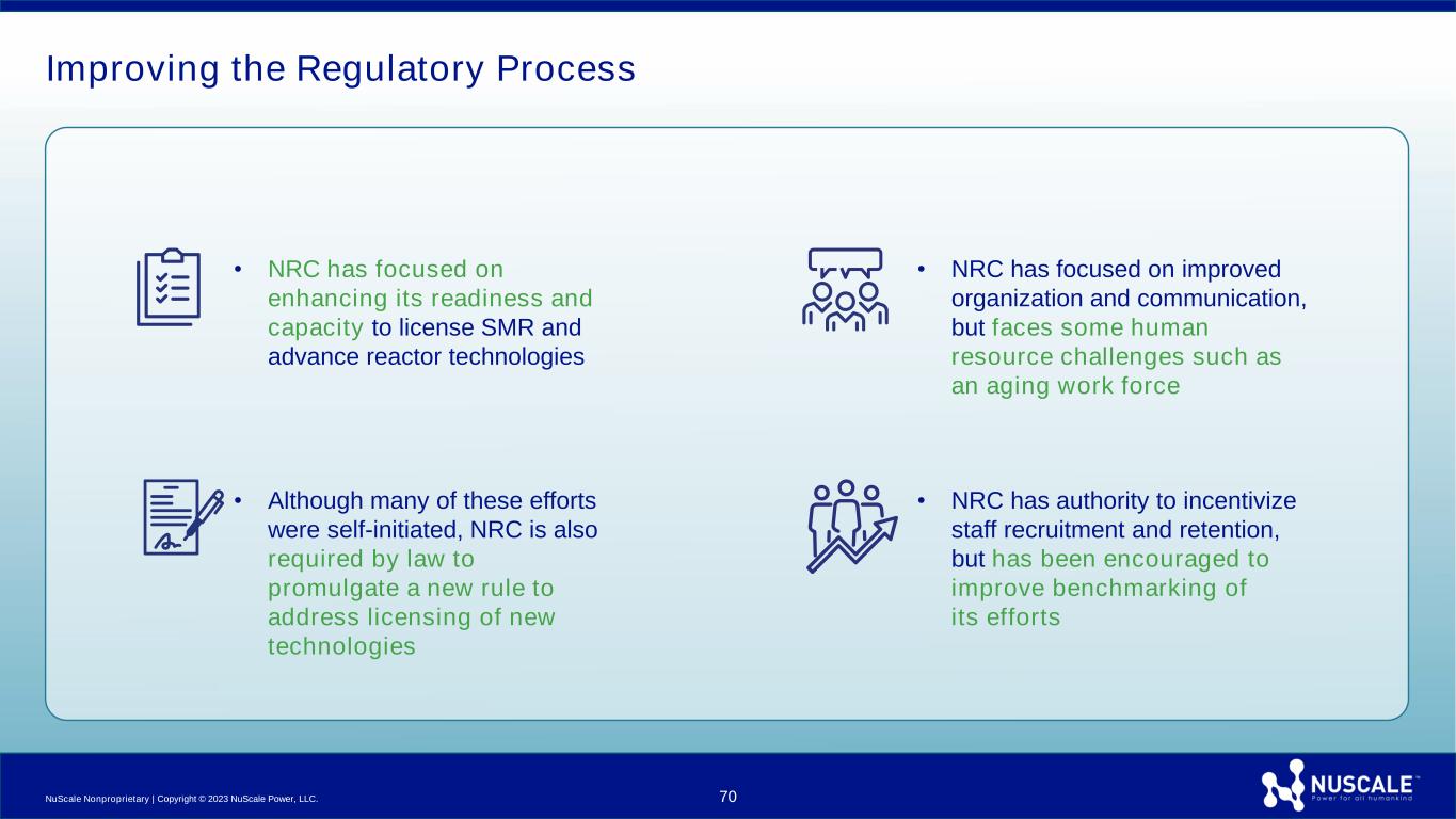70NuScale Nonproprietary | Copyright © 2023 NuScale Power, LLC. Improving the Regulatory Process • NRC has focused on enhancing its readiness and capacity to license SMR and advance reactor technologies • NRC has focused on improved organization and communication, but faces some human resource challenges such as an aging work force • NRC has authority to incentivize staff recruitment and retention, but has been encouraged to improve benchmarking of its efforts • Although many of these efforts were self-initiated, NRC is also required by law to promulgate a new rule to address licensing of new technologies