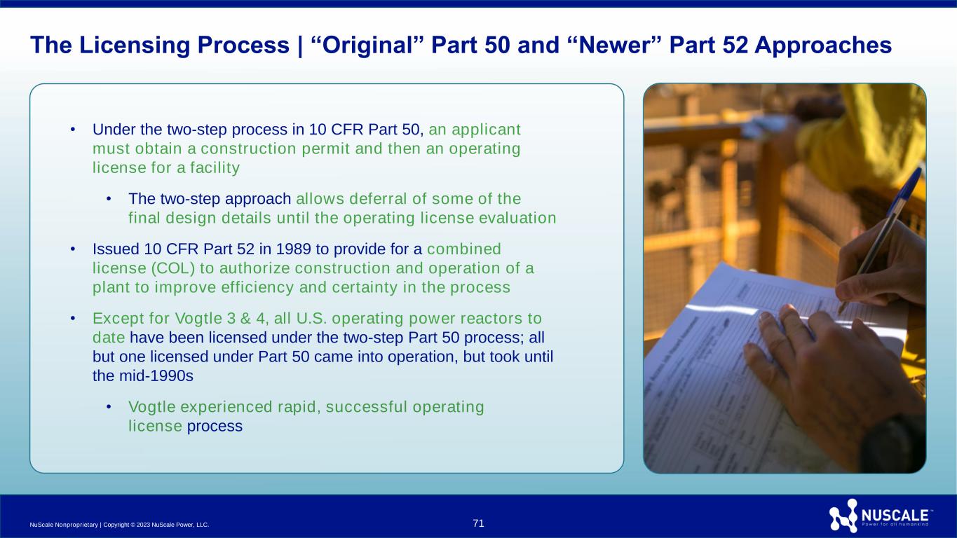 71NuScale Nonproprietary | Copyright © 2023 NuScale Power, LLC. The Licensing Process | “Original” Part 50 and “Newer” Part 52 Approaches • Under the two-step process in 10 CFR Part 50, an applicant must obtain a construction permit and then an operating license for a facility • The two-step approach allows deferral of some of the final design details until the operating license evaluation • Issued 10 CFR Part 52 in 1989 to provide for a combined license (COL) to authorize construction and operation of a plant to improve efficiency and certainty in the process • Except for Vogtle 3 & 4, all U.S. operating power reactors to date have been licensed under the two-step Part 50 process; all but one licensed under Part 50 came into operation, but took until the mid-1990s • Vogtle experienced rapid, successful operating license process