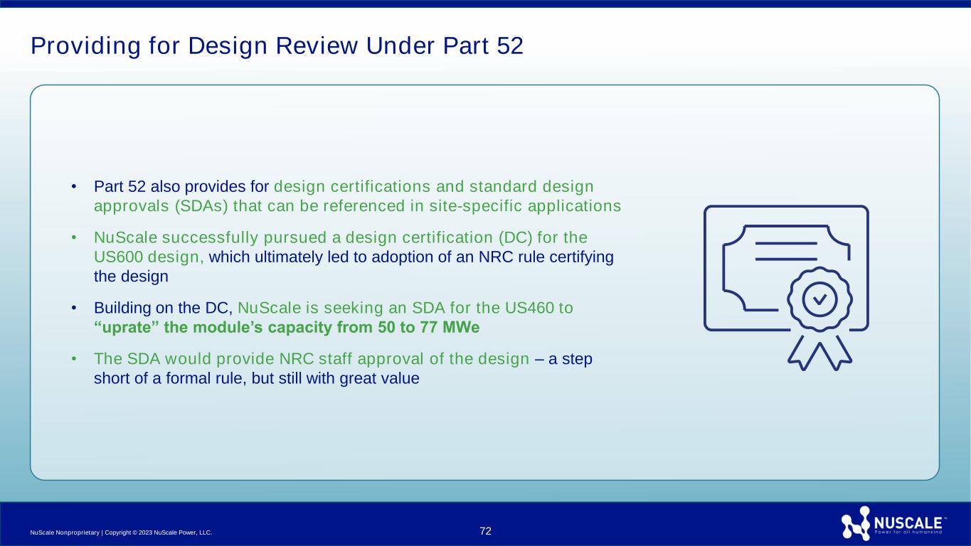 72NuScale Nonproprietary | Copyright © 2023 NuScale Power, LLC. Providing for Design Review Under Part 52 • Part 52 also provides for design certifications and standard design approvals (SDAs) that can be referenced in site-specific applications • NuScale successfully pursued a design certification (DC) for the US600 design, which ultimately led to adoption of an NRC rule certifying the design • Building on the DC, NuScale is seeking an SDA for the US460 to “uprate” the module’s capacity from 50 to 77 MWe • The SDA would provide NRC staff approval of the design – a step short of a formal rule, but still with great value