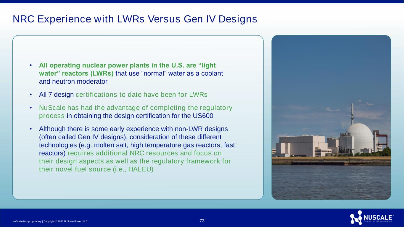 73NuScale Nonproprietary | Copyright © 2023 NuScale Power, LLC. NRC Experience with LWRs Versus Gen IV Designs • All operating nuclear power plants in the U.S. are “light water” reactors (LWRs) that use “normal” water as a coolant and neutron moderator • All 7 design certifications to date have been for LWRs • NuScale has had the advantage of completing the regulatory process in obtaining the design certification for the US600 • Although there is some early experience with non-LWR designs (often called Gen IV designs), consideration of these different technologies (e.g. molten salt, high temperature gas reactors, fast reactors) requires additional NRC resources and focus on their design aspects as well as the regulatory framework for their novel fuel source (i.e., HALEU)