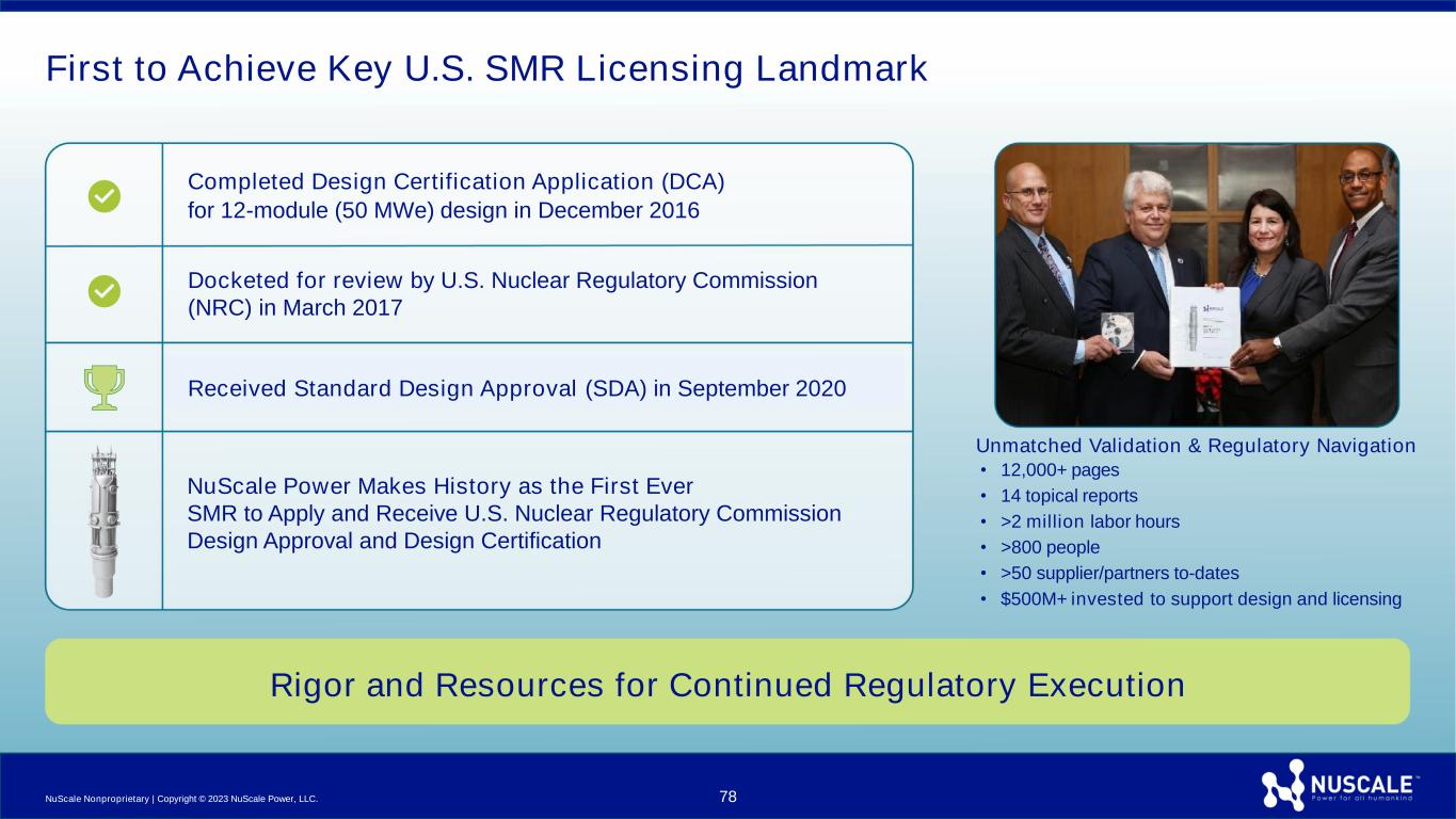 77NuScale Nonproprietary | Copyright © 2023 NuScale Power, LLC. Proven advanced nuclear leadership with a history of achieving regulatory firsts Balanced approach to domestic and international regulatory harmonization Expertise drives successful regulator engagements and strategies to preserve the design and keep projects on schedule Clear short-term initiatives and long-term strategy that put customer value creation first Regulatory Licensing and Harmonization Priorities