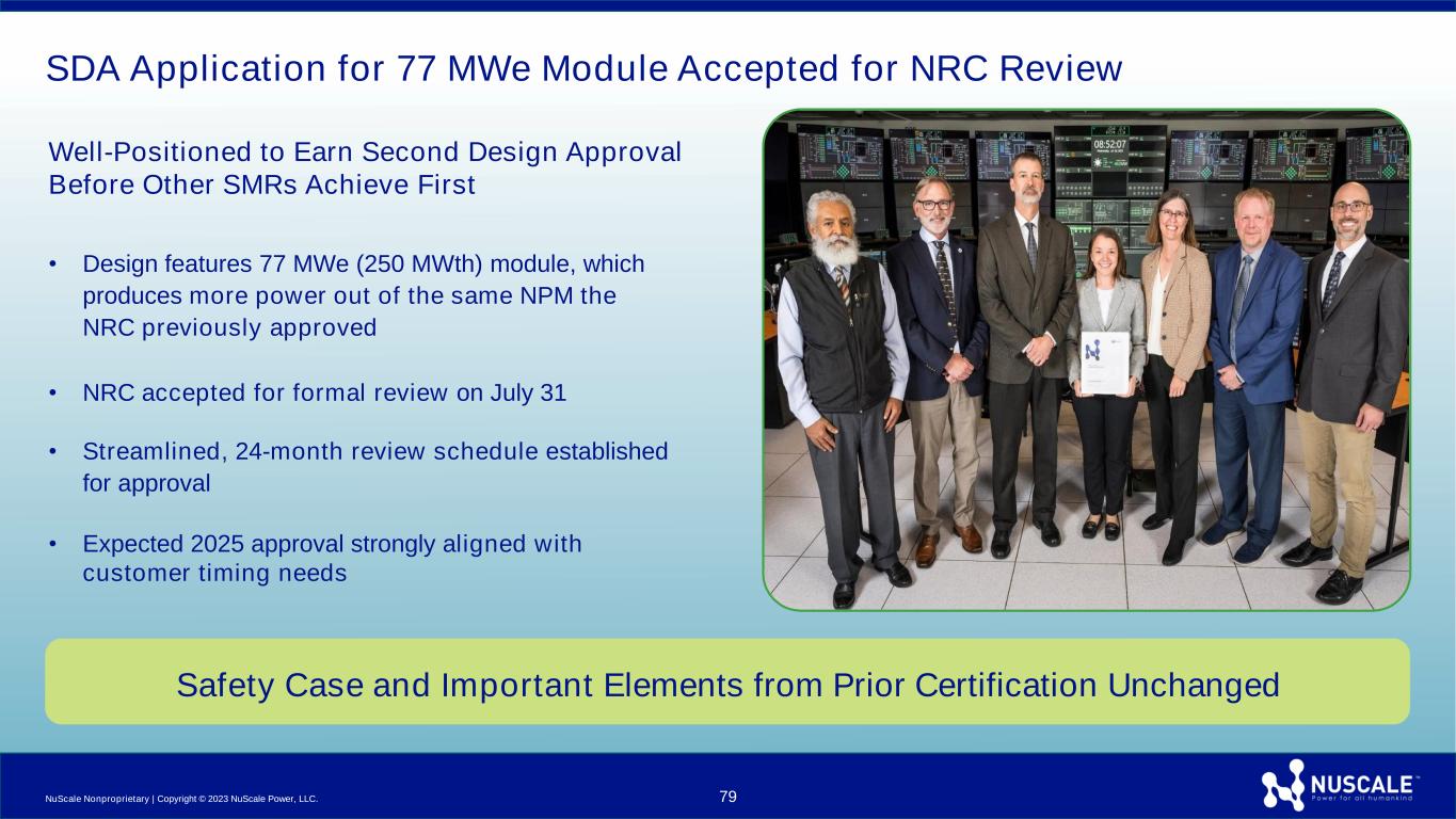 78NuScale Nonproprietary | Copyright © 2023 NuScale Power, LLC. Rigor and Resources for Continued Regulatory Execution • 12,000+ pages • 14 topical reports • >2 million labor hours • >800 people • >50 supplier/partners to-dates • $500M+ invested to support design and licensing Completed Design Certification Application (DCA) for 12-module (50 MWe) design in December 2016 Docketed for review by U.S. Nuclear Regulatory Commission (NRC) in March 2017 NuScale Power Makes History as the First Ever SMR to Apply and Receive U.S. Nuclear Regulatory Commission Design Approval and Design Certification Received Standard Design Approval (SDA) in September 2020 Unmatched Validation & Regulatory Navigation First to Achieve Key U.S. SMR Licensing Landmark