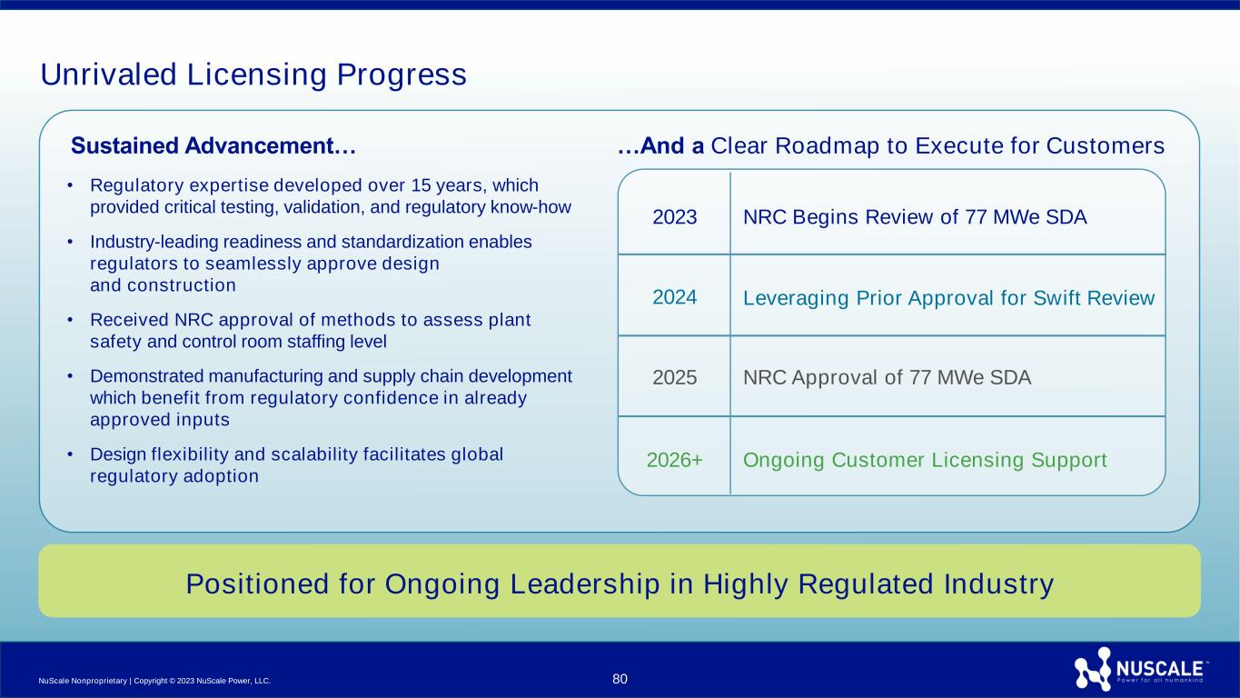 79NuScale Nonproprietary | Copyright © 2023 NuScale Power, LLC. Safety Case and Important Elements from Prior Certification Unchanged Well-Positioned to Earn Second Design Approval Before Other SMRs Achieve First • Design features 77 MWe (250 MWth) module, which produces more power out of the same NPM the NRC previously approved • NRC accepted for formal review on July 31 • Streamlined, 24-month review schedule established for approval • Expected 2025 approval strongly aligned with customer timing needs SDA Application for 77 MWe Module Accepted for NRC Review