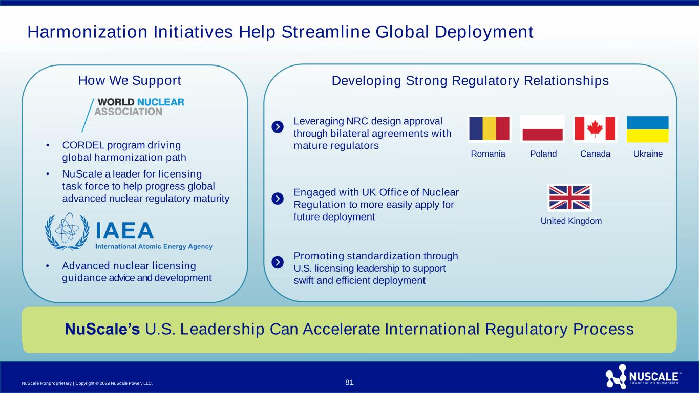 81NuScale Nonproprietary | Copyright © 2023 NuScale Power, LLC.2 NuScale’s U.S. Leadership Can Accelerate International Regulatory Process Engaged with UK Office of Nuclear Regulation to more easily apply for future deployment Leveraging NRC design approval through bilateral agreements with mature regulators Promoting standardization through U.S. licensing leadership to support swift and efficient deployment • CORDEL program driving global harmonization path • NuScale a leader for licensing task force to help progress global advanced nuclear regulatory maturity • Advanced nuclear licensing guidance advice and development How We Support United Kingdom Developing Strong Regulatory Relationships CanadaRomania Poland Ukraine Harmonization Initiatives Help Streamline Global Deployment