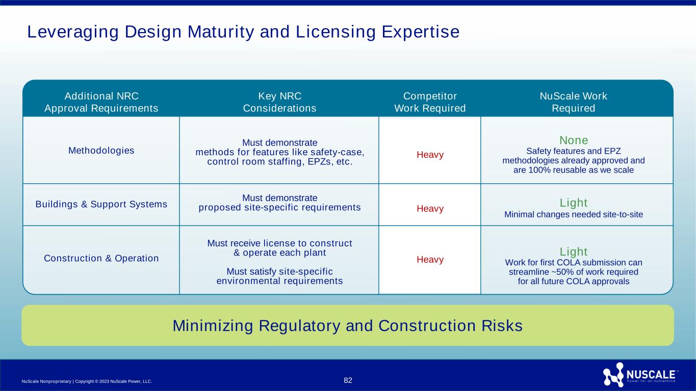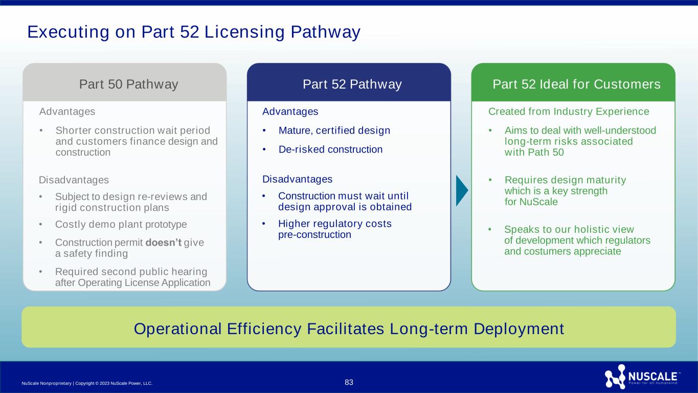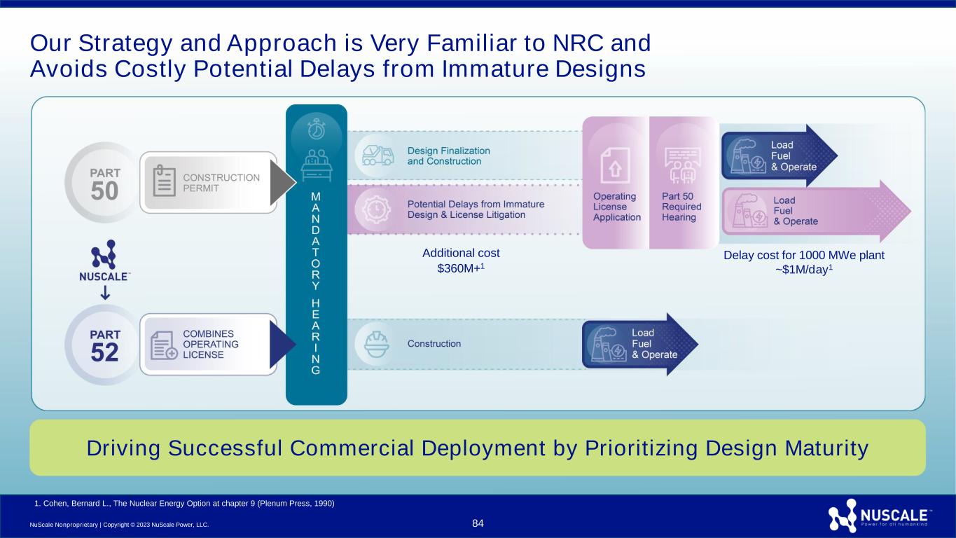 83NuScale Nonproprietary | Copyright © 2023 NuScale Power, LLC. Part 52 PathwayPart 50 Pathway Advantages • Shorter construction wait period and customers finance design and construction Disadvantages • Subject to design re-reviews and rigid construction plans • Costly demo plant prototype • Construction permit doesn’t give a safety finding • Required second public hearing after Operating License Application Part 52 Ideal for Customers Operational Efficiency Facilitates Long-term Deployment Advantages • Mature, certified design • De-risked construction Disadvantages • Construction must wait until design approval is obtained • Higher regulatory costs pre-construction Created from Industry Experience • Aims to deal with well-understood long-term risks associated with Path 50 • Requires design maturity which is a key strength for NuScale • Speaks to our holistic view of development which regulators and costumers appreciate Executing on Part 52 Licensing Pathway
