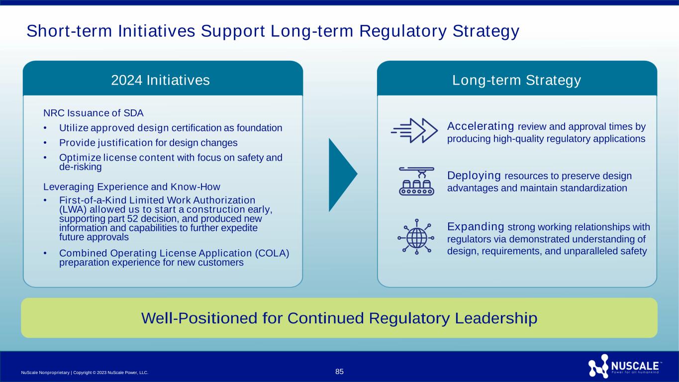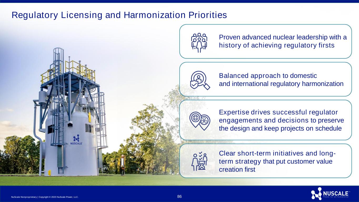 85NuScale Nonproprietary | Copyright © 2023 NuScale Power, LLC. 2024 Initiatives NRC Issuance of SDA • Utilize approved design certification as foundation • Provide justification for design changes • Optimize license content with focus on safety and de-risking Leveraging Experience and Know-How • First-of-a-Kind Limited Work Authorization (LWA) allowed us to start a construction early, supporting part 52 decision, and produced new information and capabilities to further expedite future approvals • Combined Operating License Application (COLA) preparation experience for new customers Long-term Strategy Accelerating review and approval times by producing high-quality regulatory applications Deploying resources to preserve design advantages and maintain standardization Expanding strong working relationships with regulators via demonstrated understanding of design, requirements, and unparalleled safety Well-Positioned for Continued Regulatory Leadership Short-term Initiatives Support Long-term Regulatory Strategy
