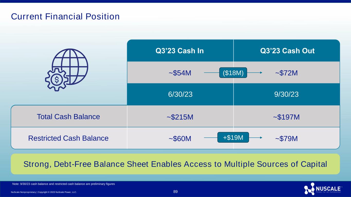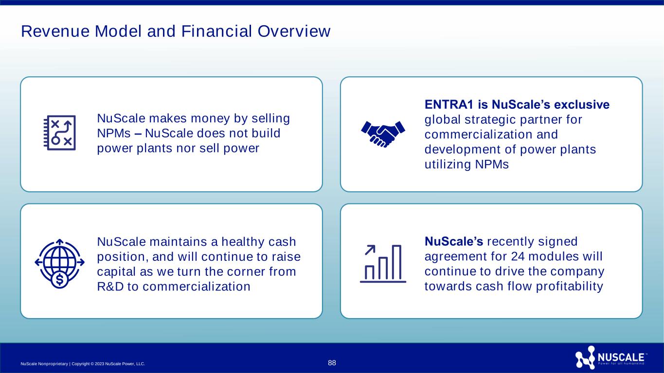 88NuScale Nonproprietary | Copyright © 2023 NuScale Power, LLC. NuScale’s recently signed agreement for 24 modules will continue to drive the company towards cash flow profitability ENTRA1 is NuScale’s exclusive global strategic partner for commercialization and development of power plants utilizing NPMs NuScale maintains a healthy cash position, and will continue to raise capital as we turn the corner from R&D to commercialization NuScale makes money by selling NPMs – NuScale does not build power plants nor sell power Revenue Model and Financial Overview