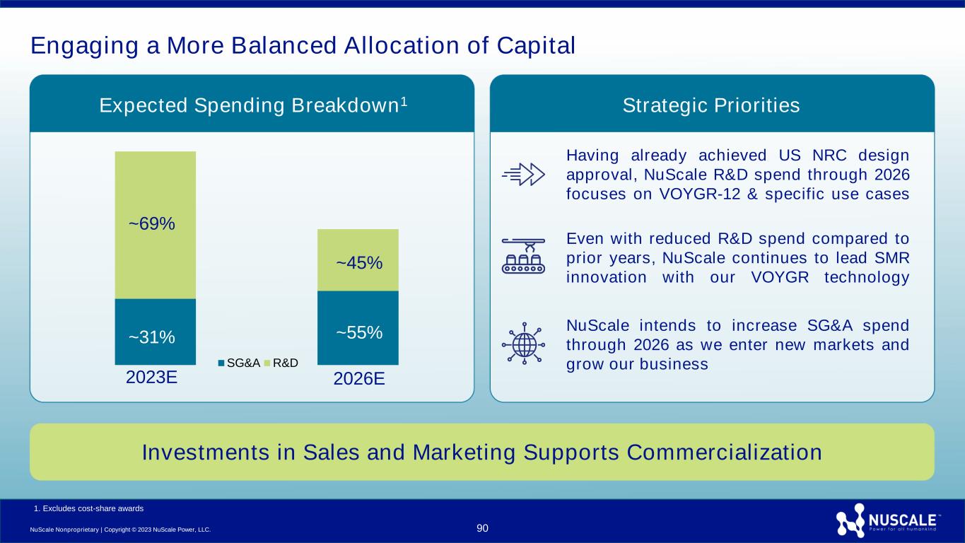 90NuScale Nonproprietary | Copyright © 2023 NuScale Power, LLC. SG&A R&D ~31% ~69% Investments in Sales and Marketing Supports Commercialization Engaging a More Balanced Allocation of Capital Expected Spending Breakdown1 1. Excludes cost-share awards Strategic Priorities ~45% ~55% 2023E 2026E Having already achieved US NRC design approval, NuScale R&D spend through 2026 focuses on VOYGR-12 & specific use cases Even with reduced R&D spend compared to prior years, NuScale continues to lead SMR innovation with our VOYGR technology NuScale intends to increase SG&A spend through 2026 as we enter new markets and grow our business