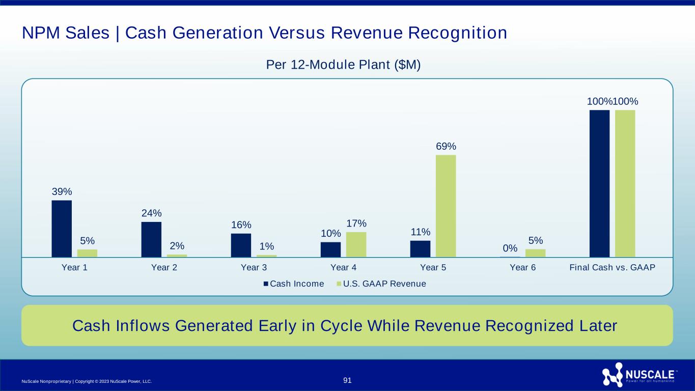 91NuScale Nonproprietary | Copyright © 2023 NuScale Power, LLC. Cash Inflows Generated Early in Cycle While Revenue Recognized Later NPM Sales | Cash Generation Versus Revenue Recognition 39% 24% 16% 10% 11% 0% 100% 5% 2% 1% 17% 69% 5% 100% Year 1 Year 2 Year 3 Year 4 Year 5 Year 6 Final Cash vs. GAAP Per 12-Module Plant ($M) Cash Income U.S. GAAP Revenue