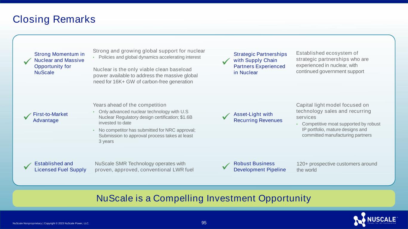 95NuScale Nonproprietary | Copyright © 2023 NuScale Power, LLC. NuScale is a Compelling Investment Opportunity Closing Remarks 120+ prospective customers around the world Robust Business Development Pipeline Strong Momentum in Nuclear and Massive Opportunity for NuScale Strong and growing global support for nuclear • Policies and global dynamics accelerating interest Nuclear is the only viable clean baseload power available to address the massive global need for 16K+ GW of carbon-free generation First-to-Market Advantage Years ahead of the competition • Only advanced nuclear technology with U.S Nuclear Regulatory design certification; $1.6B invested to date • No competitor has submitted for NRC approval; Submission to approval process takes at least 3 years Strategic Partnerships with Supply Chain Partners Experienced in Nuclear Established ecosystem of strategic partnerships who are experienced in nuclear, with continued government support Established and Licensed Fuel Supply NuScale SMR Technology operates with proven, approved, conventional LWR fuel Asset-Light with Recurring Revenues Capital light model focused on technology sales and recurring services • Competitive moat supported by robust IP portfolio, mature designs and committed manufacturing partners