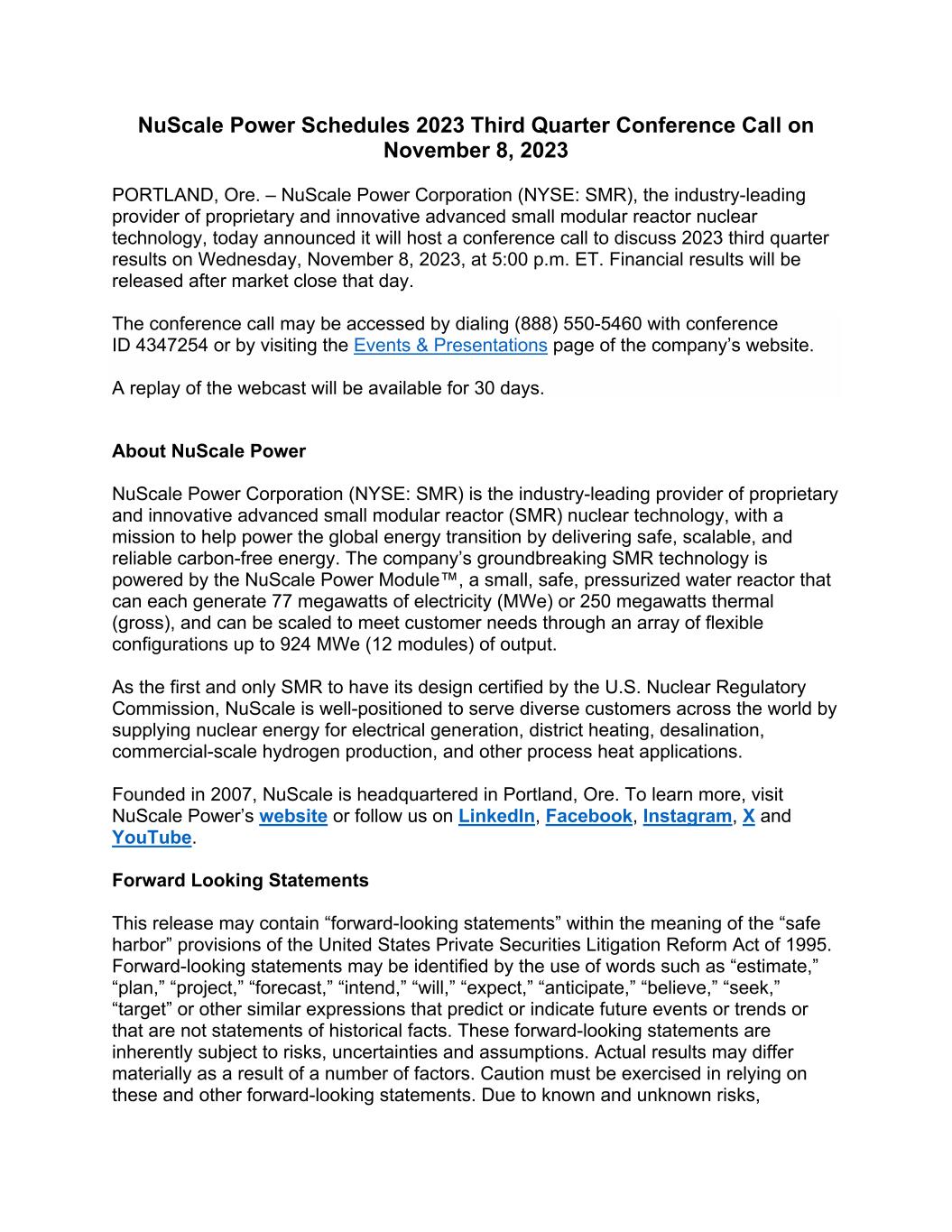 NuScale Power Schedules 2023 Third Quarter Conference Call on November 8, 2023 PORTLAND, Ore. – NuScale Power Corporation (NYSE: SMR), the industry-leading provider of proprietary and innovative advanced small modular reactor nuclear technology, today announced it will host a conference call to discuss 2023 third quarter results on Wednesday, November 8, 2023, at 5:00 p.m. ET. Financial results will be released after market close that day. The conference call may be accessed by dialing (888) 550-5460 with conference ID 4347254 or by visiting the Events & Presentations page of the company’s website. A replay of the webcast will be available for 30 days. About NuScale Power NuScale Power Corporation (NYSE: SMR) is the industry-leading provider of proprietary and innovative advanced small modular reactor (SMR) nuclear technology, with a mission to help power the global energy transition by delivering safe, scalable, and reliable carbon-free energy. The company’s groundbreaking SMR technology is powered by the NuScale Power Module™, a small, safe, pressurized water reactor that can each generate 77 megawatts of electricity (MWe) or 250 megawatts thermal (gross), and can be scaled to meet customer needs through an array of flexible configurations up to 924 MWe (12 modules) of output. As the first and only SMR to have its design certified by the U.S. Nuclear Regulatory Commission, NuScale is well-positioned to serve diverse customers across the world by supplying nuclear energy for electrical generation, district heating, desalination, commercial-scale hydrogen production, and other process heat applications. Founded in 2007, NuScale is headquartered in Portland, Ore. To learn more, visit NuScale Power’s website or follow us on LinkedIn, Facebook, Instagram, X and YouTube. Forward Looking Statements This release may contain “forward-looking statements” within the meaning of the “safe harbor” provisions of the United States Private Securities Litigation Reform Act of 1995. Forward-looking statements may be identified by the use of words such as “estimate,” “plan,” “project,” “forecast,” “intend,” “will,” “expect,” “anticipate,” “believe,” “seek,” “target” or other similar expressions that predict or indicate future events or trends or that are not statements of historical facts. These forward-looking statements are inherently subject to risks, uncertainties and assumptions. Actual results may differ materially as a result of a number of factors. Caution must be exercised in relying on these and other forward-looking statements. Due to known and unknown risks,