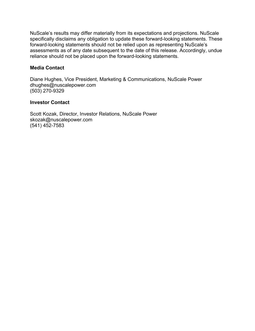NuScale’s results may differ materially from its expectations and projections. NuScale specifically disclaims any obligation to update these forward-looking statements. These forward-looking statements should not be relied upon as representing NuScale’s assessments as of any date subsequent to the date of this release. Accordingly, undue reliance should not be placed upon the forward-looking statements. Media Contact Diane Hughes, Vice President, Marketing & Communications, NuScale Power dhughes@nuscalepower.com (503) 270-9329 Investor Contact Scott Kozak, Director, Investor Relations, NuScale Power skozak@nuscalepower.com (541) 452-7583
