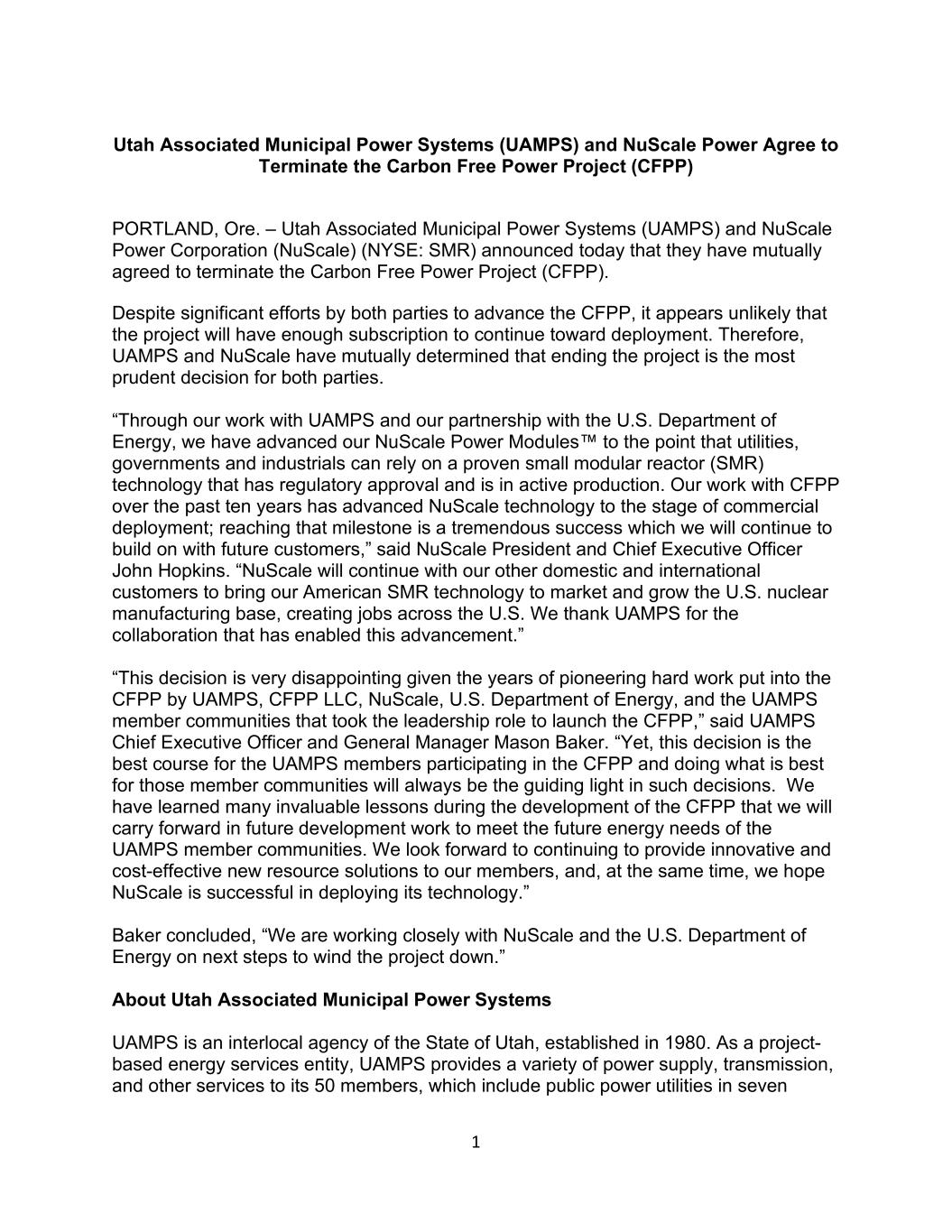 1 Utah Associated Municipal Power Systems (UAMPS) and NuScale Power Agree to Terminate the Carbon Free Power Project (CFPP) PORTLAND, Ore. – Utah Associated Municipal Power Systems (UAMPS) and NuScale Power Corporation (NuScale) (NYSE: SMR) announced today that they have mutually agreed to terminate the Carbon Free Power Project (CFPP). Despite significant efforts by both parties to advance the CFPP, it appears unlikely that the project will have enough subscription to continue toward deployment. Therefore, UAMPS and NuScale have mutually determined that ending the project is the most prudent decision for both parties. “Through our work with UAMPS and our partnership with the U.S. Department of Energy, we have advanced our NuScale Power Modules™ to the point that utilities, governments and industrials can rely on a proven small modular reactor (SMR) technology that has regulatory approval and is in active production. Our work with CFPP over the past ten years has advanced NuScale technology to the stage of commercial deployment; reaching that milestone is a tremendous success which we will continue to build on with future customers,” said NuScale President and Chief Executive Officer John Hopkins. “NuScale will continue with our other domestic and international customers to bring our American SMR technology to market and grow the U.S. nuclear manufacturing base, creating jobs across the U.S. We thank UAMPS for the collaboration that has enabled this advancement.” “This decision is very disappointing given the years of pioneering hard work put into the CFPP by UAMPS, CFPP LLC, NuScale, U.S. Department of Energy, and the UAMPS member communities that took the leadership role to launch the CFPP,” said UAMPS Chief Executive Officer and General Manager Mason Baker. “Yet, this decision is the best course for the UAMPS members participating in the CFPP and doing what is best for those member communities will always be the guiding light in such decisions. We have learned many invaluable lessons during the development of the CFPP that we will carry forward in future development work to meet the future energy needs of the UAMPS member communities. We look forward to continuing to provide innovative and cost-effective new resource solutions to our members, and, at the same time, we hope NuScale is successful in deploying its technology.” Baker concluded, “We are working closely with NuScale and the U.S. Department of Energy on next steps to wind the project down.” About Utah Associated Municipal Power Systems UAMPS is an interlocal agency of the State of Utah, established in 1980. As a project- based energy services entity, UAMPS provides a variety of power supply, transmission, and other services to its 50 members, which include public power utilities in seven