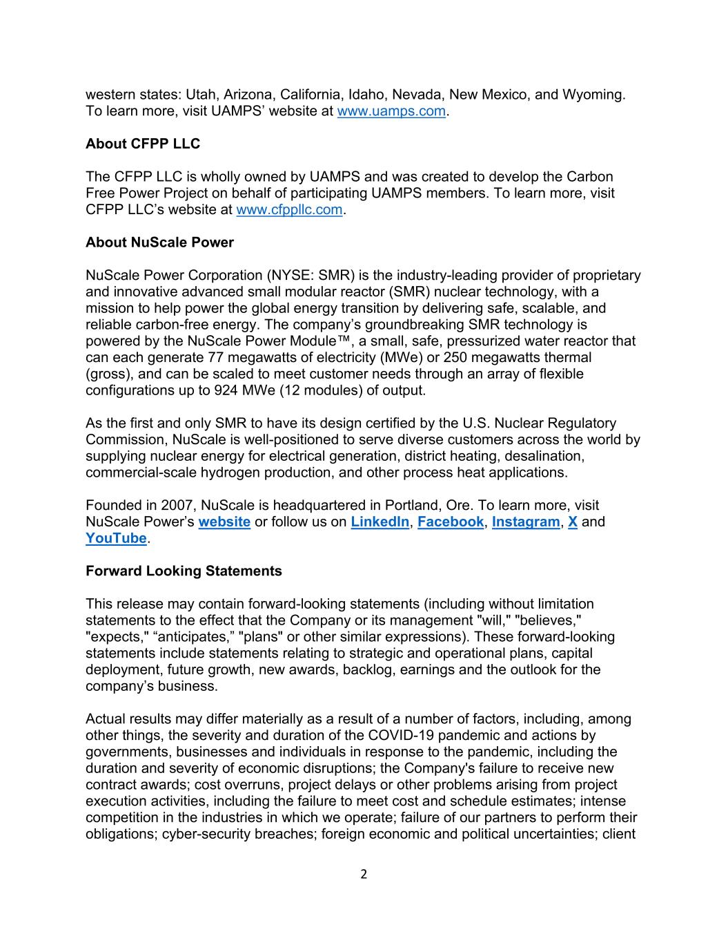 2 western states: Utah, Arizona, California, Idaho, Nevada, New Mexico, and Wyoming. To learn more, visit UAMPS’ website at www.uamps.com. About CFPP LLC The CFPP LLC is wholly owned by UAMPS and was created to develop the Carbon Free Power Project on behalf of participating UAMPS members. To learn more, visit CFPP LLC’s website at www.cfppllc.com. About NuScale Power NuScale Power Corporation (NYSE: SMR) is the industry-leading provider of proprietary and innovative advanced small modular reactor (SMR) nuclear technology, with a mission to help power the global energy transition by delivering safe, scalable, and reliable carbon-free energy. The company’s groundbreaking SMR technology is powered by the NuScale Power Module™, a small, safe, pressurized water reactor that can each generate 77 megawatts of electricity (MWe) or 250 megawatts thermal (gross), and can be scaled to meet customer needs through an array of flexible configurations up to 924 MWe (12 modules) of output. As the first and only SMR to have its design certified by the U.S. Nuclear Regulatory Commission, NuScale is well-positioned to serve diverse customers across the world by supplying nuclear energy for electrical generation, district heating, desalination, commercial-scale hydrogen production, and other process heat applications. Founded in 2007, NuScale is headquartered in Portland, Ore. To learn more, visit NuScale Power’s website or follow us on LinkedIn, Facebook, Instagram, X and YouTube. Forward Looking Statements This release may contain forward-looking statements (including without limitation statements to the effect that the Company or its management "will," "believes," "expects," “anticipates,” "plans" or other similar expressions). These forward-looking statements include statements relating to strategic and operational plans, capital deployment, future growth, new awards, backlog, earnings and the outlook for the company’s business. Actual results may differ materially as a result of a number of factors, including, among other things, the severity and duration of the COVID-19 pandemic and actions by governments, businesses and individuals in response to the pandemic, including the duration and severity of economic disruptions; the Company's failure to receive new contract awards; cost overruns, project delays or other problems arising from project execution activities, including the failure to meet cost and schedule estimates; intense competition in the industries in which we operate; failure of our partners to perform their obligations; cyber-security breaches; foreign economic and political uncertainties; client