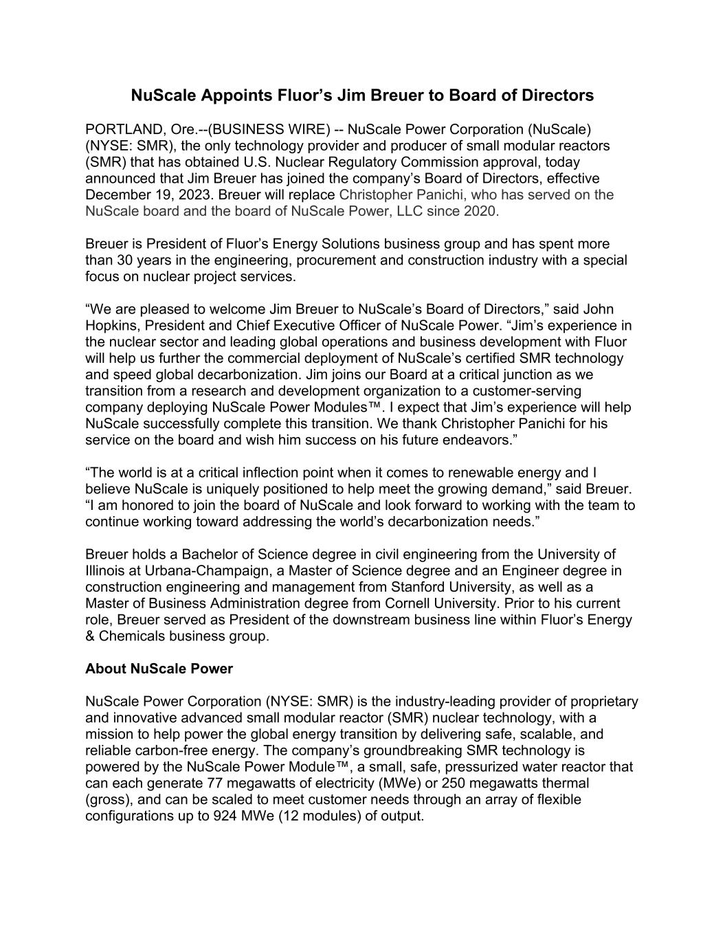 NuScale Appoints Fluor’s Jim Breuer to Board of Directors PORTLAND, Ore.--(BUSINESS WIRE) -- NuScale Power Corporation (NuScale) (NYSE: SMR), the only technology provider and producer of small modular reactors (SMR) that has obtained U.S. Nuclear Regulatory Commission approval, today announced that Jim Breuer has joined the company’s Board of Directors, effective December 19, 2023. Breuer will replace Christopher Panichi, who has served on the NuScale board and the board of NuScale Power, LLC since 2020. Breuer is President of Fluor’s Energy Solutions business group and has spent more than 30 years in the engineering, procurement and construction industry with a special focus on nuclear project services. “We are pleased to welcome Jim Breuer to NuScale’s Board of Directors,” said John Hopkins, President and Chief Executive Officer of NuScale Power. “Jim’s experience in the nuclear sector and leading global operations and business development with Fluor will help us further the commercial deployment of NuScale’s certified SMR technology and speed global decarbonization. Jim joins our Board at a critical junction as we transition from a research and development organization to a customer-serving company deploying NuScale Power Modules™. I expect that Jim’s experience will help NuScale successfully complete this transition. We thank Christopher Panichi for his service on the board and wish him success on his future endeavors.” “The world is at a critical inflection point when it comes to renewable energy and I believe NuScale is uniquely positioned to help meet the growing demand,” said Breuer. “I am honored to join the board of NuScale and look forward to working with the team to continue working toward addressing the world’s decarbonization needs.” Breuer holds a Bachelor of Science degree in civil engineering from the University of Illinois at Urbana-Champaign, a Master of Science degree and an Engineer degree in construction engineering and management from Stanford University, as well as a Master of Business Administration degree from Cornell University. Prior to his current role, Breuer served as President of the downstream business line within Fluor’s Energy & Chemicals business group. About NuScale Power NuScale Power Corporation (NYSE: SMR) is the industry-leading provider of proprietary and innovative advanced small modular reactor (SMR) nuclear technology, with a mission to help power the global energy transition by delivering safe, scalable, and reliable carbon-free energy. The company’s groundbreaking SMR technology is powered by the NuScale Power Module™, a small, safe, pressurized water reactor that can each generate 77 megawatts of electricity (MWe) or 250 megawatts thermal (gross), and can be scaled to meet customer needs through an array of flexible configurations up to 924 MWe (12 modules) of output.