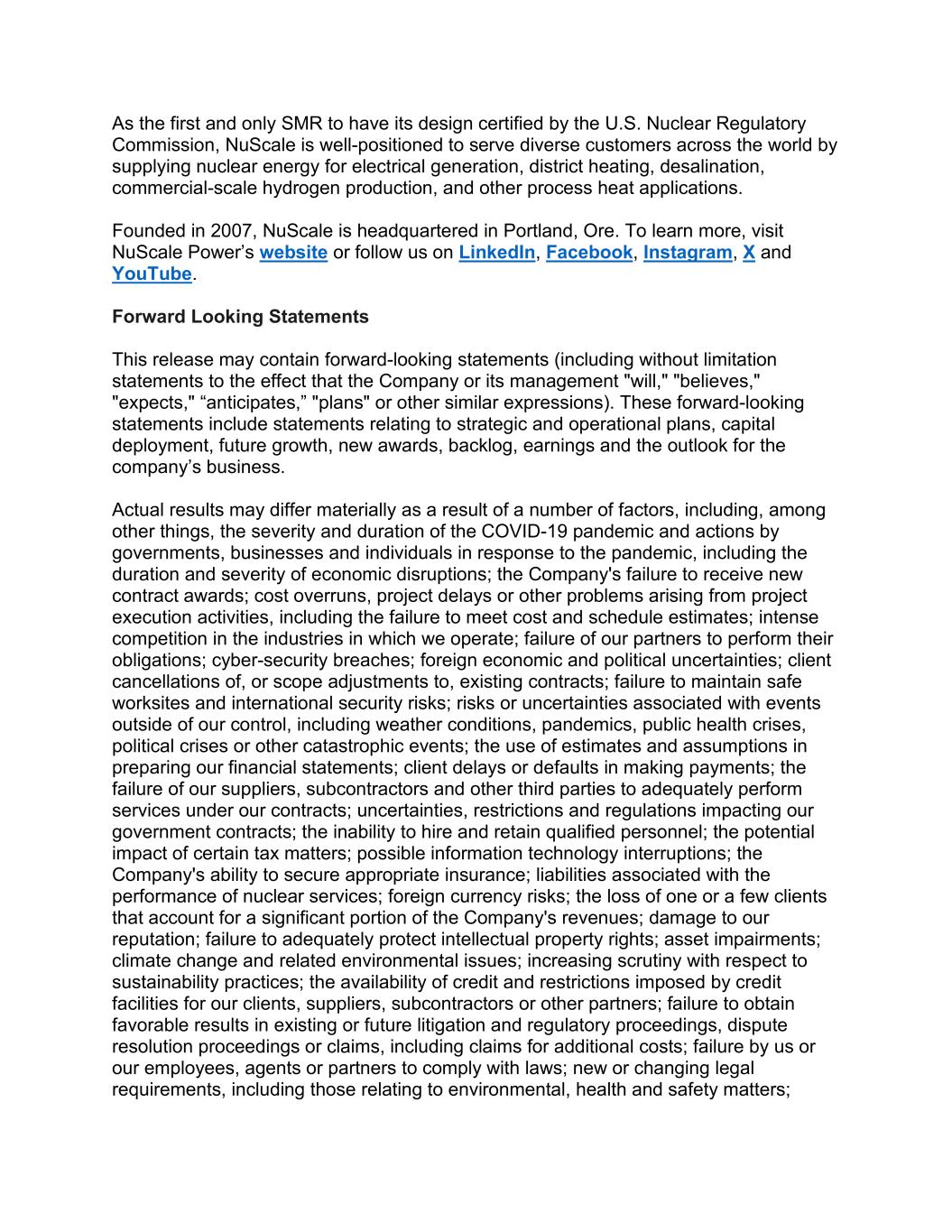 As the first and only SMR to have its design certified by the U.S. Nuclear Regulatory Commission, NuScale is well-positioned to serve diverse customers across the world by supplying nuclear energy for electrical generation, district heating, desalination, commercial-scale hydrogen production, and other process heat applications. Founded in 2007, NuScale is headquartered in Portland, Ore. To learn more, visit NuScale Power’s website or follow us on LinkedIn, Facebook, Instagram, X and YouTube. Forward Looking Statements This release may contain forward-looking statements (including without limitation statements to the effect that the Company or its management "will," "believes," "expects," “anticipates,” "plans" or other similar expressions). These forward-looking statements include statements relating to strategic and operational plans, capital deployment, future growth, new awards, backlog, earnings and the outlook for the company’s business. Actual results may differ materially as a result of a number of factors, including, among other things, the severity and duration of the COVID-19 pandemic and actions by governments, businesses and individuals in response to the pandemic, including the duration and severity of economic disruptions; the Company's failure to receive new contract awards; cost overruns, project delays or other problems arising from project execution activities, including the failure to meet cost and schedule estimates; intense competition in the industries in which we operate; failure of our partners to perform their obligations; cyber-security breaches; foreign economic and political uncertainties; client cancellations of, or scope adjustments to, existing contracts; failure to maintain safe worksites and international security risks; risks or uncertainties associated with events outside of our control, including weather conditions, pandemics, public health crises, political crises or other catastrophic events; the use of estimates and assumptions in preparing our financial statements; client delays or defaults in making payments; the failure of our suppliers, subcontractors and other third parties to adequately perform services under our contracts; uncertainties, restrictions and regulations impacting our government contracts; the inability to hire and retain qualified personnel; the potential impact of certain tax matters; possible information technology interruptions; the Company's ability to secure appropriate insurance; liabilities associated with the performance of nuclear services; foreign currency risks; the loss of one or a few clients that account for a significant portion of the Company's revenues; damage to our reputation; failure to adequately protect intellectual property rights; asset impairments; climate change and related environmental issues; increasing scrutiny with respect to sustainability practices; the availability of credit and restrictions imposed by credit facilities for our clients, suppliers, subcontractors or other partners; failure to obtain favorable results in existing or future litigation and regulatory proceedings, dispute resolution proceedings or claims, including claims for additional costs; failure by us or our employees, agents or partners to comply with laws; new or changing legal requirements, including those relating to environmental, health and safety matters;