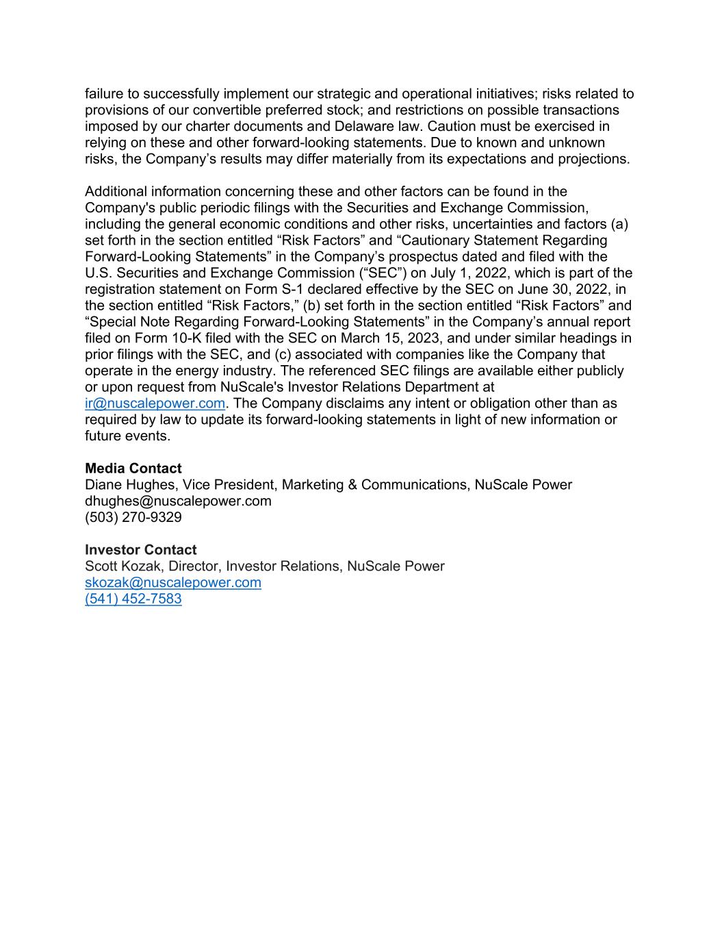 failure to successfully implement our strategic and operational initiatives; risks related to provisions of our convertible preferred stock; and restrictions on possible transactions imposed by our charter documents and Delaware law. Caution must be exercised in relying on these and other forward-looking statements. Due to known and unknown risks, the Company’s results may differ materially from its expectations and projections. Additional information concerning these and other factors can be found in the Company's public periodic filings with the Securities and Exchange Commission, including the general economic conditions and other risks, uncertainties and factors (a) set forth in the section entitled “Risk Factors” and “Cautionary Statement Regarding Forward-Looking Statements” in the Company’s prospectus dated and filed with the U.S. Securities and Exchange Commission (“SEC”) on July 1, 2022, which is part of the registration statement on Form S-1 declared effective by the SEC on June 30, 2022, in the section entitled “Risk Factors,” (b) set forth in the section entitled “Risk Factors” and “Special Note Regarding Forward-Looking Statements” in the Company’s annual report filed on Form 10-K filed with the SEC on March 15, 2023, and under similar headings in prior filings with the SEC, and (c) associated with companies like the Company that operate in the energy industry. The referenced SEC filings are available either publicly or upon request from NuScale's Investor Relations Department at ir@nuscalepower.com. The Company disclaims any intent or obligation other than as required by law to update its forward-looking statements in light of new information or future events. Media Contact Diane Hughes, Vice President, Marketing & Communications, NuScale Power dhughes@nuscalepower.com (503) 270-9329 Investor Contact Scott Kozak, Director, Investor Relations, NuScale Power skozak@nuscalepower.com (541) 452-7583