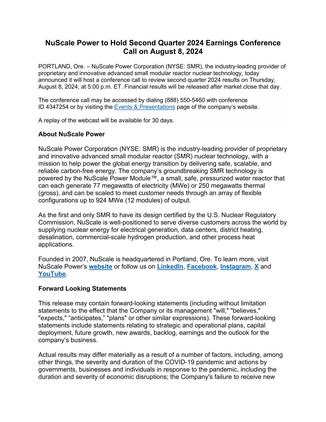 NuScale Power to Hold Second Quarter 2024 Earnings Conference Call on August 8, 2024 PORTLAND, Ore. – NuScale Power Corporation (NYSE: SMR), the industry-leading provider of proprietary and innovative advanced small modular reactor nuclear technology, today announced it will host a conference call to review second quarter 2024 results on Thursday, August 8, 2024, at 5:00 p.m. ET. Financial results will be released after market close that day. The conference call may be accessed by dialing (888) 550-5460 with conference ID 4347254 or by visiting the Events & Presentations page of the company’s website. A replay of the webcast will be available for 30 days. About NuScale Power NuScale Power Corporation (NYSE: SMR) is the industry-leading provider of proprietary and innovative advanced small modular reactor (SMR) nuclear technology, with a mission to help power the global energy transition by delivering safe, scalable, and reliable carbon-free energy. The company’s groundbreaking SMR technology is powered by the NuScale Power Module™, a small, safe, pressurized water reactor that can each generate 77 megawatts of electricity (MWe) or 250 megawatts thermal (gross), and can be scaled to meet customer needs through an array of flexible configurations up to 924 MWe (12 modules) of output. As the first and only SMR to have its design certified by the U.S. Nuclear Regulatory Commission, NuScale is well-positioned to serve diverse customers across the world by supplying nuclear energy for electrical generation, data centers, district heating, desalination, commercial-scale hydrogen production, and other process heat applications. Founded in 2007, NuScale is headquartered in Portland, Ore. To learn more, visit NuScale Power’s website or follow us on LinkedIn, Facebook, Instagram, X and YouTube. Forward Looking Statements This release may contain forward-looking statements (including without limitation statements to the effect that the Company or its management "will," "believes," "expects," “anticipates,” "plans" or other similar expressions). These forward-looking statements include statements relating to strategic and operational plans, capital deployment, future growth, new awards, backlog, earnings and the outlook for the company’s business. Actual results may differ materially as a result of a number of factors, including, among other things, the severity and duration of the COVID-19 pandemic and actions by governments, businesses and individuals in response to the pandemic, including the duration and severity of economic disruptions; the Company's failure to receive new