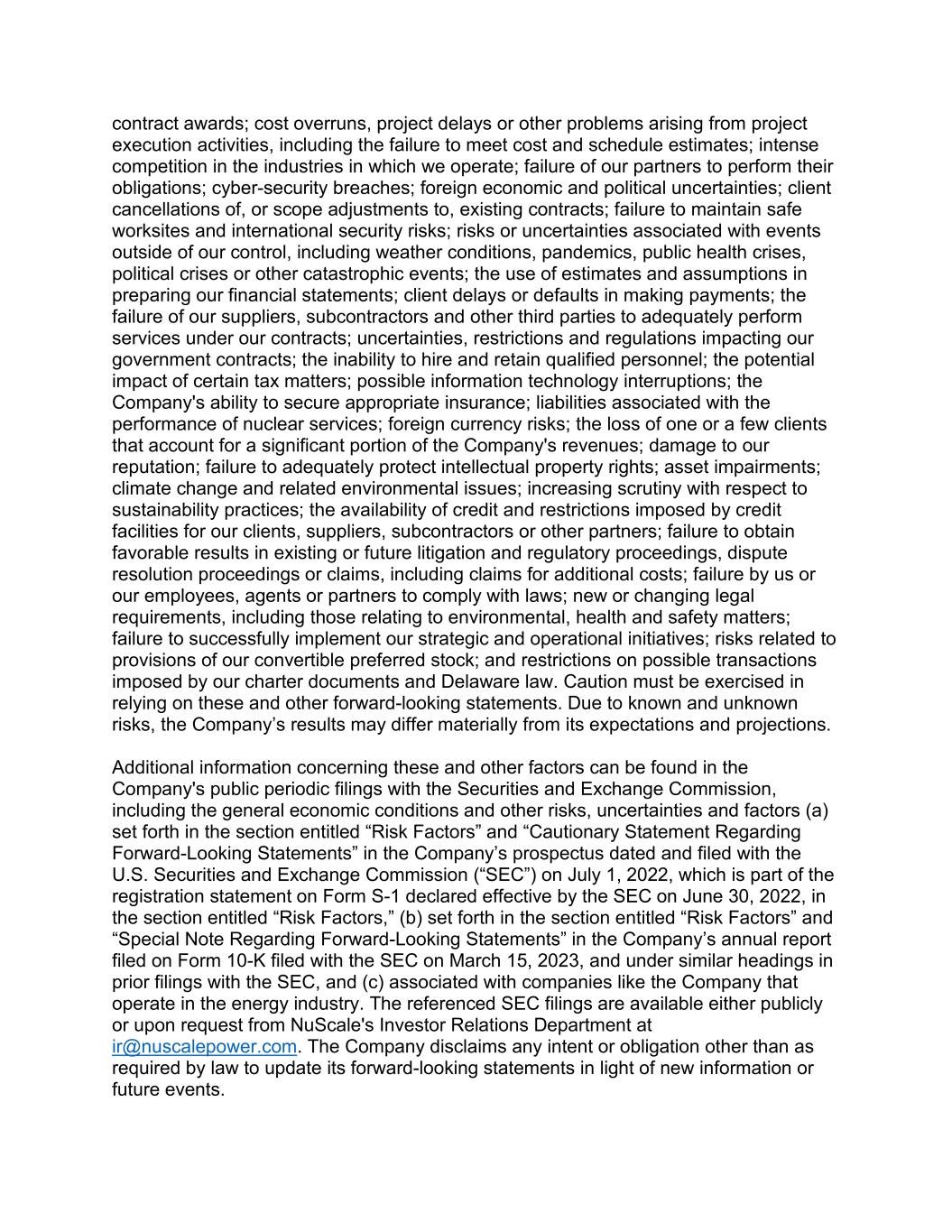 contract awards; cost overruns, project delays or other problems arising from project execution activities, including the failure to meet cost and schedule estimates; intense competition in the industries in which we operate; failure of our partners to perform their obligations; cyber-security breaches; foreign economic and political uncertainties; client cancellations of, or scope adjustments to, existing contracts; failure to maintain safe worksites and international security risks; risks or uncertainties associated with events outside of our control, including weather conditions, pandemics, public health crises, political crises or other catastrophic events; the use of estimates and assumptions in preparing our financial statements; client delays or defaults in making payments; the failure of our suppliers, subcontractors and other third parties to adequately perform services under our contracts; uncertainties, restrictions and regulations impacting our government contracts; the inability to hire and retain qualified personnel; the potential impact of certain tax matters; possible information technology interruptions; the Company's ability to secure appropriate insurance; liabilities associated with the performance of nuclear services; foreign currency risks; the loss of one or a few clients that account for a significant portion of the Company's revenues; damage to our reputation; failure to adequately protect intellectual property rights; asset impairments; climate change and related environmental issues; increasing scrutiny with respect to sustainability practices; the availability of credit and restrictions imposed by credit facilities for our clients, suppliers, subcontractors or other partners; failure to obtain favorable results in existing or future litigation and regulatory proceedings, dispute resolution proceedings or claims, including claims for additional costs; failure by us or our employees, agents or partners to comply with laws; new or changing legal requirements, including those relating to environmental, health and safety matters; failure to successfully implement our strategic and operational initiatives; risks related to provisions of our convertible preferred stock; and restrictions on possible transactions imposed by our charter documents and Delaware law. Caution must be exercised in relying on these and other forward-looking statements. Due to known and unknown risks, the Company’s results may differ materially from its expectations and projections. Additional information concerning these and other factors can be found in the Company's public periodic filings with the Securities and Exchange Commission, including the general economic conditions and other risks, uncertainties and factors (a) set forth in the section entitled “Risk Factors” and “Cautionary Statement Regarding Forward-Looking Statements” in the Company’s prospectus dated and filed with the U.S. Securities and Exchange Commission (“SEC”) on July 1, 2022, which is part of the registration statement on Form S-1 declared effective by the SEC on June 30, 2022, in the section entitled “Risk Factors,” (b) set forth in the section entitled “Risk Factors” and “Special Note Regarding Forward-Looking Statements” in the Company’s annual report filed on Form 10-K filed with the SEC on March 15, 2023, and under similar headings in prior filings with the SEC, and (c) associated with companies like the Company that operate in the energy industry. The referenced SEC filings are available either publicly or upon request from NuScale's Investor Relations Department at ir@nuscalepower.com. The Company disclaims any intent or obligation other than as required by law to update its forward-looking statements in light of new information or future events.