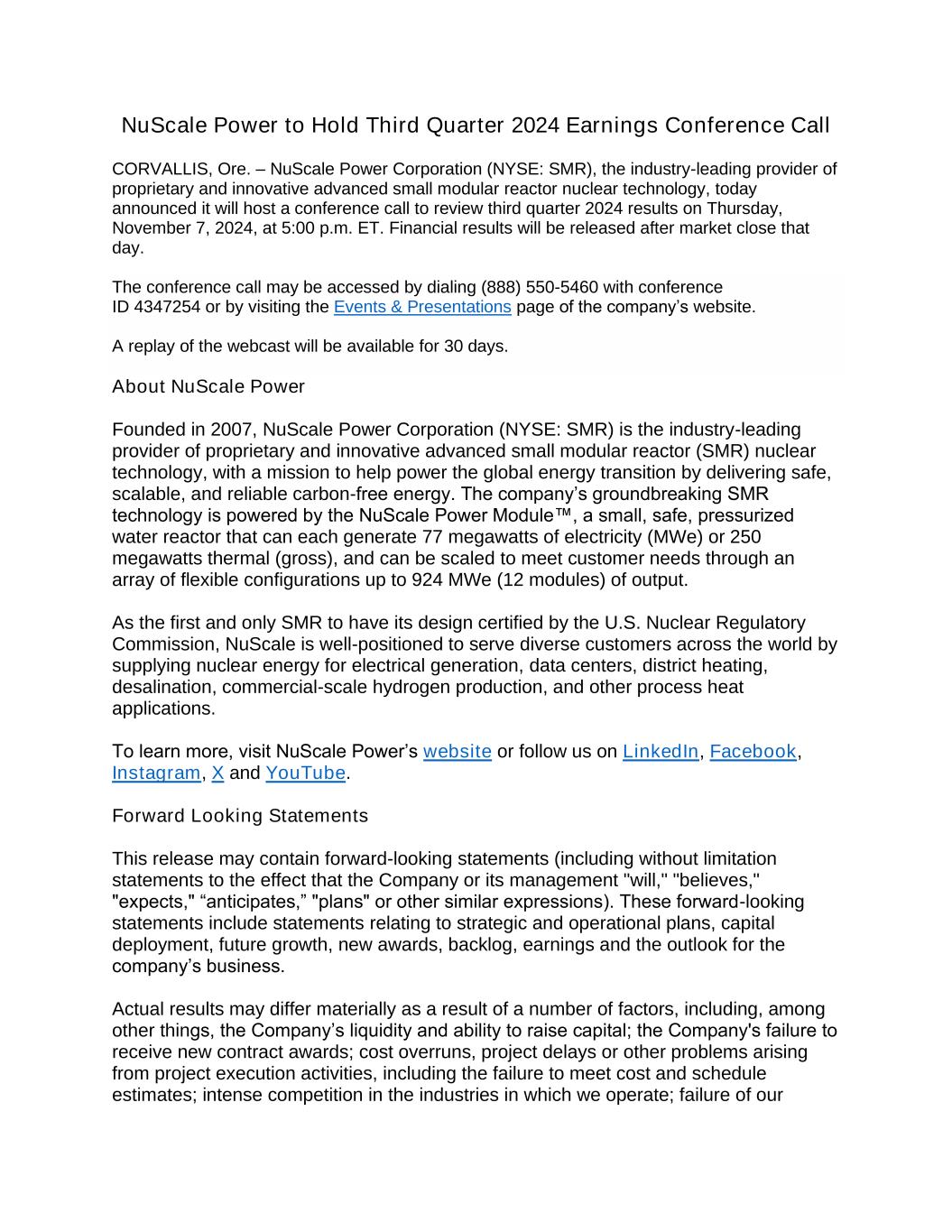 NuScale Power to Hold Third Quarter 2024 Earnings Conference Call CORVALLIS, Ore. – NuScale Power Corporation (NYSE: SMR), the industry-leading provider of proprietary and innovative advanced small modular reactor nuclear technology, today announced it will host a conference call to review third quarter 2024 results on Thursday, November 7, 2024, at 5:00 p.m. ET. Financial results will be released after market close that day. The conference call may be accessed by dialing (888) 550-5460 with conference ID 4347254 or by visiting the Events & Presentations page of the company’s website. A replay of the webcast will be available for 30 days. About NuScale Power Founded in 2007, NuScale Power Corporation (NYSE: SMR) is the industry-leading provider of proprietary and innovative advanced small modular reactor (SMR) nuclear technology, with a mission to help power the global energy transition by delivering safe, scalable, and reliable carbon-free energy. The company’s groundbreaking SMR technology is powered by the NuScale Power Module™, a small, safe, pressurized water reactor that can each generate 77 megawatts of electricity (MWe) or 250 megawatts thermal (gross), and can be scaled to meet customer needs through an array of flexible configurations up to 924 MWe (12 modules) of output. As the first and only SMR to have its design certified by the U.S. Nuclear Regulatory Commission, NuScale is well-positioned to serve diverse customers across the world by supplying nuclear energy for electrical generation, data centers, district heating, desalination, commercial-scale hydrogen production, and other process heat applications. To learn more, visit NuScale Power’s website or follow us on LinkedIn, Facebook, Instagram, X and YouTube. Forward Looking Statements This release may contain forward-looking statements (including without limitation statements to the effect that the Company or its management "will," "believes," "expects," “anticipates,” "plans" or other similar expressions). These forward-looking statements include statements relating to strategic and operational plans, capital deployment, future growth, new awards, backlog, earnings and the outlook for the company’s business. Actual results may differ materially as a result of a number of factors, including, among other things, the Company’s liquidity and ability to raise capital; the Company's failure to receive new contract awards; cost overruns, project delays or other problems arising from project execution activities, including the failure to meet cost and schedule estimates; intense competition in the industries in which we operate; failure of our