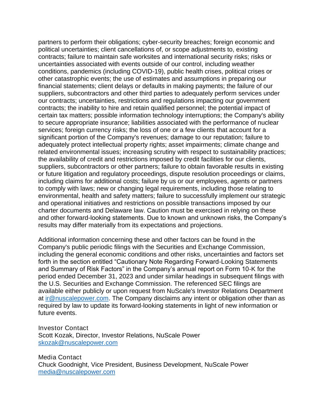 partners to perform their obligations; cyber-security breaches; foreign economic and political uncertainties; client cancellations of, or scope adjustments to, existing contracts; failure to maintain safe worksites and international security risks; risks or uncertainties associated with events outside of our control, including weather conditions, pandemics (including COVID-19), public health crises, political crises or other catastrophic events; the use of estimates and assumptions in preparing our financial statements; client delays or defaults in making payments; the failure of our suppliers, subcontractors and other third parties to adequately perform services under our contracts; uncertainties, restrictions and regulations impacting our government contracts; the inability to hire and retain qualified personnel; the potential impact of certain tax matters; possible information technology interruptions; the Company's ability to secure appropriate insurance; liabilities associated with the performance of nuclear services; foreign currency risks; the loss of one or a few clients that account for a significant portion of the Company's revenues; damage to our reputation; failure to adequately protect intellectual property rights; asset impairments; climate change and related environmental issues; increasing scrutiny with respect to sustainability practices; the availability of credit and restrictions imposed by credit facilities for our clients, suppliers, subcontractors or other partners; failure to obtain favorable results in existing or future litigation and regulatory proceedings, dispute resolution proceedings or claims, including claims for additional costs; failure by us or our employees, agents or partners to comply with laws; new or changing legal requirements, including those relating to environmental, health and safety matters; failure to successfully implement our strategic and operational initiatives and restrictions on possible transactions imposed by our charter documents and Delaware law. Caution must be exercised in relying on these and other forward-looking statements. Due to known and unknown risks, the Company’s results may differ materially from its expectations and projections. Additional information concerning these and other factors can be found in the Company's public periodic filings with the Securities and Exchange Commission, including the general economic conditions and other risks, uncertainties and factors set forth in the section entitled “Cautionary Note Regarding Forward-Looking Statements and Summary of Risk Factors” in the Company’s annual report on Form 10-K for the period ended December 31, 2023 and under similar headings in subsequent filings with the U.S. Securities and Exchange Commission. The referenced SEC filings are available either publicly or upon request from NuScale's Investor Relations Department at ir@nuscalepower.com. The Company disclaims any intent or obligation other than as required by law to update its forward-looking statements in light of new information or future events. Investor Contact Scott Kozak, Director, Investor Relations, NuScale Power skozak@nuscalepower.com Media Contact Chuck Goodnight, Vice President, Business Development, NuScale Power media@nuscalepower.com