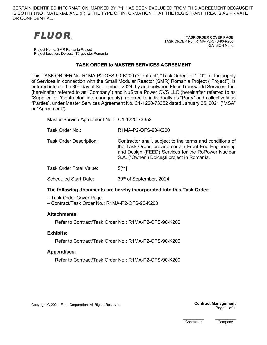 TASK ORDER COVER PAGE TASK ORDER No.: R1MA-P2-OFS-90-K200 REVISION No. 0 Project Name: SMR Romania Project Romania Copyright © 2021 Contract Management Page 1 of 1 Contractor Company TASK ORDER to MASTER SERVICES AGREEMENT T TASK ORDER No. R1MA-P2-OFS-90-K200 ( “ ” ) for the of in connection with the Project (“Project”) into on the 30th September No. C1-1220-73352 25 2021 (“MSA” or “Agreement”). C1-1220-73352 R1MA-P2-OFS-90-K200 - . : $[**] 30th of September The following documents are hereby incorporated into this Task Order: – – Contract/ -P2-OFS-90-K200 Attachments: Refer to -P2-OFS-90-K200 Exhibits: Refer to -P2-OFS-90-K200 Appendices: Refer to -P2-OFS-90-K200 CERTAIN IDENTIFIED INFORMATION, MARKED BY [**], HAS BEEN EXCLUDED FROM THIS AGREEMENT BECAUSE IT IS BOTH (I) NOT MATERIAL AND (II) IS THE TYPE OF INFORMATION THAT THE REGISTRANT TREATS AS PRIVATE OR CONFIDENTIAL.
