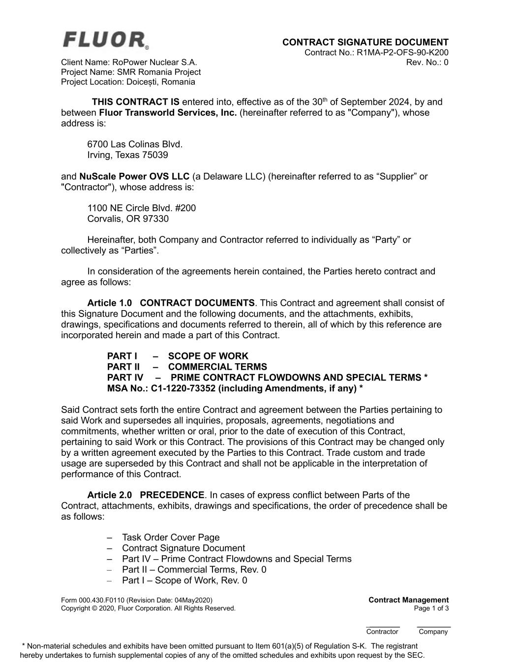 CONTRACT SIGNATURE DOCUMENT Contract No.: R1MA-P2-OFS-90-K200 Client Name: RoPower Nuclear S.A. Rev. No.: 0 Project Name: SMR Romania Project Project Location: Form 000.430.F0110 (Revision Date: 04May2020) Contract Management Copyright © 2020 Page 1 of 3 _________ _________ Contractor Company THIS CONTRACT IS the 30th of September 2024 between Fluor Transworld Services, Inc. NuScale Power OVS LLC (a Delaware LLC) “Supplier” or 1100 NE Corvalis OR 97330 collectively as “Parties”. agree as follows: Article 1.0 CONTRACT DOCUMENTS. art of this Contract. PART I – SCOPE OF WORK PART II – COMMERCIAL TERMS PART IV – PRIME CONTRACT FLOWDOWNS AND SPECIAL TERMS * MSA No.: C1-1220-73352 (including Amendments, if any) * between the Parties pertaining to . by a written agreement . performance of this Contract. Article 2.0 PRECEDENCE. Parts of the as follows: – – Contract Signature Document – Part IV – – Part II – – Part I – * Non-material schedules and exhibits have been omitted pursuant to Item 601(a)(5) of Regulation S-K. The registrant hereby undertakes to furnish supplemental copies of any of the omitted schedules and exhibits upon request by the SEC.