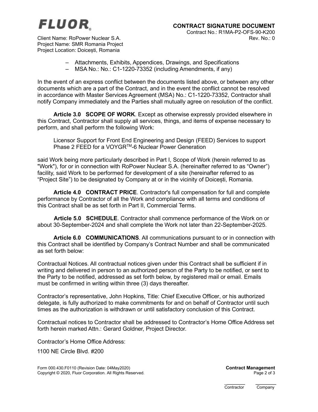 CONTRACT SIGNATURE DOCUMENT Contract No.: R1MA-P2-OFS-90-K200 Client Name: RoPower Nuclear S.A. Rev. No.: 0 Project Name: SMR Romania Project Project Location: Form 000.430.F0110 (Revision Date: 04May2020) Contract Management Copyright © 2020 Page 2 of 3 _________ _________ Contractor Company – Attachments Drawings Specifications – MSA No.: No.: C1-1220- Master Services Agreement (MSA) No.: C1-1220- Contractor shall the Parties shall mutually agree on resolution of the conflict. Article 3.0 SCOPE OF WORK. : (FEED) Services to support Phase 2 FEED for a VOYGR -6 Nuclear Power Generation RoPower Nuclear S.A. ) “Project Site”) . Article 4.0 CONTRACT PRICE. Contractor's full this Contract shall be as set forth in . Article 5.0 SCHEDULE. about 30-September-2024 not later than 22-September- . Article 6.0 COMMUNICATIONS. All communications pursuant to or in connection with as set forth below: Contractual Notices. Party the Party or email. Emails (3) Chief Officer Project Director.