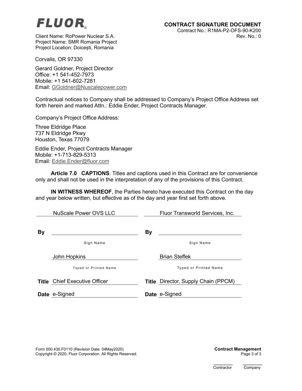 CONTRACT SIGNATURE DOCUMENT Contract No.: R1MA-P2-OFS-90-K200 Client Name: RoPower Nuclear S.A. Rev. No.: 0 Project Name: SMR Romania Project Project Location: Form 000.430.F0110 (Revision Date: 04May2020) Contract Management Copyright © 2020 Page 3 of 3 _________ _________ Contractor Company Project Director Office: +1 - -7973 Mobile: +1 -602-7281 Email: Project Office set . Project Place Mobile: +1-713-829- Email: Article 7.0 CAPTIONS. IN WITNESS WHEREOF Parties NuScale Power OVS LLC By By S i g n N a m e S i g n N a m e N a m e N a m e Title Chief Officer Title Date e- Date e-