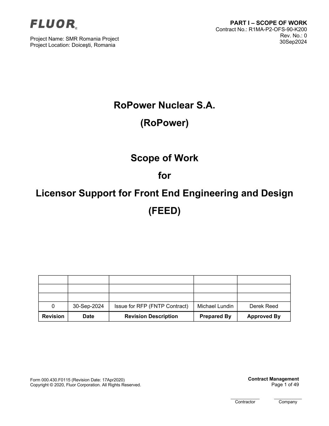 Project Name: SMR Romania Project Project Location: , Romania PART I – SCOPE OF WORK Contract No.: R1MA-P2-OFS-90-K200 Rev. No.: 0 30Sep2024 Form 000.430.F0115 (Revision Date: 17Apr2020) Copyright © 2020, Fluor Corporation. All Rights Reserved. Contract Management Page 1 of 49 Contractor Company RoPower Nuclear S.A. (RoPower) Scope of Work for Licensor Support for Front End Engineering and Design (FEED) 0 30-Sep-2024 Issue for RFP (FNTP Contract) Michael Lundin Derek Reed Revision Date Revision Description Prepared By Approved By
