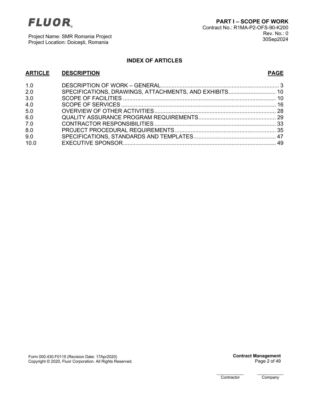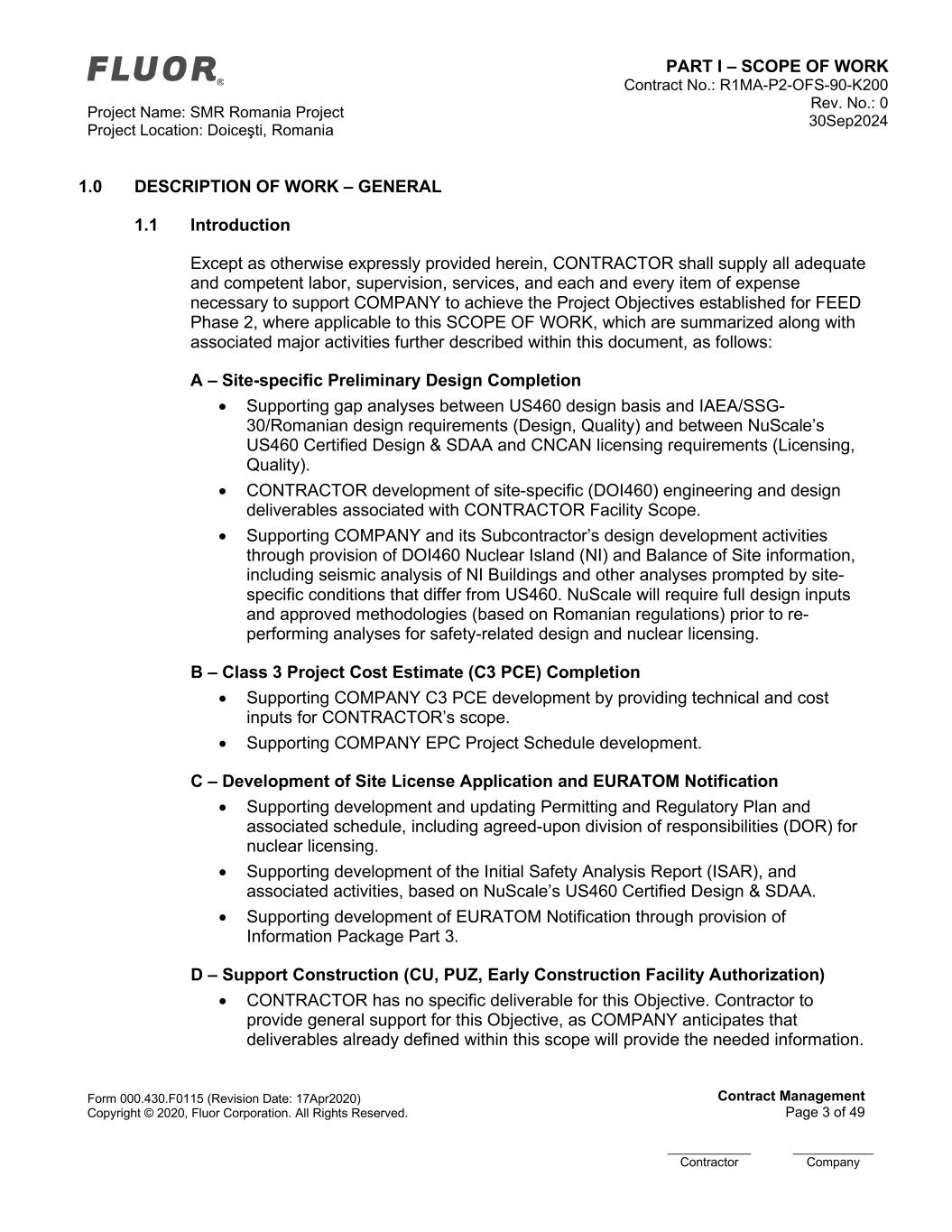 Project Name: SMR Romania Project Project Location: , Romania PART I – SCOPE OF WORK Contract No.: R1MA-P2-OFS-90-K200 Rev. No.: 0 30Sep2024 Form 000.430.F0115 (Revision Date: 17Apr2020) Copyright © 2020, Fluor Corporation. All Rights Reserved. Contract Management Page 2 of 49 Contractor Company INDEX OF ARTICLES ARTICLE DESCRIPTION PAGE 1.0 DESCRIPTION OF WORK – GENERAL........................................................................... 3 2.0 SPECIFICATIONS, DRAWINGS, ATTACHMENTS, AND EXHIBITS.............................. 10 3.0 SCOPE OF FACILITIES ................................................................................................. 10 4.0 SCOPE OF SERVICES .................................................................................................. 16 5.0 OVERVIEW OF OTHER ACTIVITIES............................................................................. 28 6.0 QUALITY ASSURANCE PROGRAM REQUIREMENTS................................................. 29 7.0 CONTRACTOR RESPONSIBILITIES ............................................................................. 33 8.0 PROJECT PROCEDURAL REQUIREMENTS................................................................ 35 9.0 SPECIFICATIONS, STANDARDS AND TEMPLATES.................................................... 47 10.0 EXECUTIVE SPONSOR................................................................................................. 49