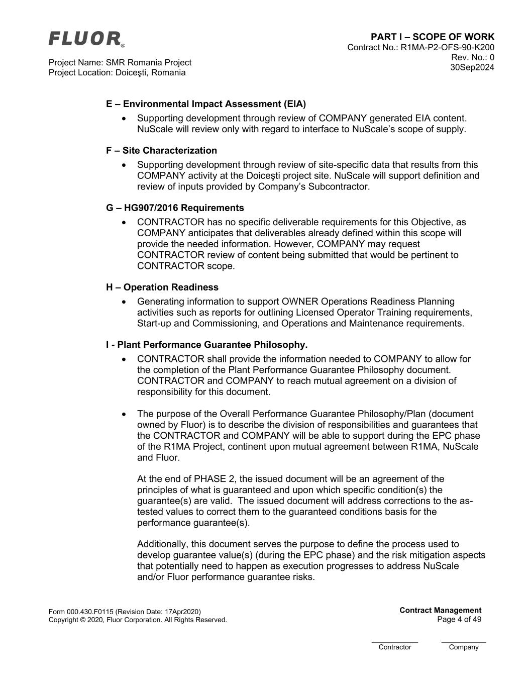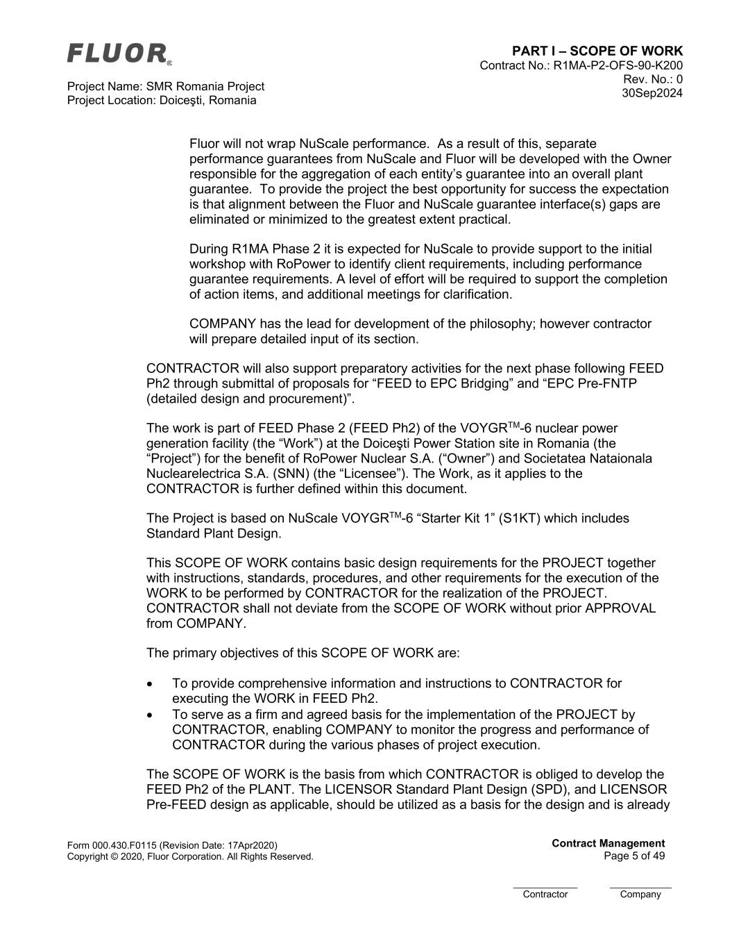 Project Name: SMR Romania Project Project Location: , Romania PART I – SCOPE OF WORK Contract No.: R1MA-P2-OFS-90-K200 Rev. No.: 0 30Sep2024 Form 000.430.F0115 (Revision Date: 17Apr2020) Copyright © 2020, Fluor Corporation. All Rights Reserved. Contract Management Page 5 of 49 Contractor Company Fluor will not wrap NuScale performance. As a result of this, separate performance guarantees from NuScale and Fluor will be developed with the Owner responsible for the aggregation of each entity’s guarantee into an overall plant guarantee. To provide the project the best opportunity for success the expectation is that alignment between the Fluor and NuScale guarantee interface(s) gaps are eliminated or minimized to the greatest extent practical. During R1MA Phase 2 it is expected for NuScale to provide support to the initial workshop with RoPower to identify client requirements, including performance guarantee requirements. A level of effort will be required to support the completion of action items, and additional meetings for clarification. COMPANY has the lead for development of the philosophy; however contractor will prepare detailed input of its section. CONTRACTOR will also support preparatory activities for the next phase following FEED Ph2 through submittal of proposals for “FEED to EPC Bridging” and “EPC Pre-FNTP (detailed design and procurement)”. The work is part of FEED Phase 2 (FEED Ph2) of the VOYGRTM-6 nuclear power “Project”) for the benefit of RoPower Nuclear S.A. (“Owner”) and Societatea Nataionala Nuclearelectrica S.A. (SNN) (the “Licensee”). The Work, as it applies to the CONTRACTOR is further defined within this document. The Project is based on NuScale VOYGRTM-6 “Starter Kit 1” (S1KT) which includes Standard Plant Design. This SCOPE OF WORK contains basic design requirements for the PROJECT together with instructions, standards, procedures, and other requirements for the execution of the WORK to be performed by CONTRACTOR for the realization of the PROJECT. CONTRACTOR shall not deviate from the SCOPE OF WORK without prior APPROVAL from COMPANY. The primary objectives of this SCOPE OF WORK are: To provide comprehensive information and instructions to CONTRACTOR for executing the WORK in FEED Ph2. To serve as a firm and agreed basis for the implementation of the PROJECT by CONTRACTOR, enabling COMPANY to monitor the progress and performance of CONTRACTOR during the various phases of project execution. The SCOPE OF WORK is the basis from which CONTRACTOR is obliged to develop the FEED Ph2 of the PLANT. The LICENSOR Standard Plant Design (SPD), and LICENSOR Pre-FEED design as applicable, should be utilized as a basis for the design and is already