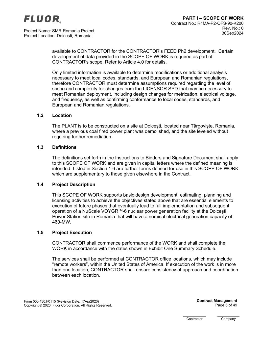 Project Name: SMR Romania Project Project Location: , Romania PART I – SCOPE OF WORK Contract No.: R1MA-P2-OFS-90-K200 Rev. No.: 0 30Sep2024 Form 000.430.F0115 (Revision Date: 17Apr2020) Copyright © 2020, Fluor Corporation. All Rights Reserved. Contract Management Page 6 of 49 Contractor Company available to CONTRACTOR for the CONTRACTOR’s FEED Ph2 development. Certain development of data provided in the SCOPE OF WORK is required as part of CONTRACTOR's scope. Refer to Article 4.0 for details. Only limited information is available to determine modifications or additional analysis necessary to meet local codes, standards, and European and Romanian regulations, therefore CONTRACTOR must determine assumptions required regarding the level of scope and complexity for changes from the LICENSOR SPD that may be necessary to meet Romanian deployment, including design changes for metrication, electrical voltage, and frequency, as well as confirming conformance to local codes, standards, and European and Romanian regulations. 1.2 Location The PLANT is to be constructed on a site at , located near , where a previous coal fired power plant was demolished, and the site leveled without requiring further remediation. 1.3 Definitions The definitions set forth in the Instructions to Bidders and Signature Document shall apply to this SCOPE OF WORK and are given in capital letters where the defined meaning is intended. Listed in Section 1.6 are further terms defined for use in this SCOPE OF WORK which are supplementary to those given elsewhere in the Contract. 1.4 Project Description This SCOPE OF WORK supports basic design development, estimating, planning and licensing activities to achieve the objectives stated above that are essential elements to execution of future phases that eventually lead to full implementation and subsequent operation of a NuScale VOYGRTM- Power Station site in Romania that will have a nominal electrical generation capacity of 460-MW. 1.5 Project Execution CONTRACTOR shall commence performance of the WORK and shall complete the WORK in accordance with the dates shown in Exhibit One Summary Schedule. The services shall be performed at CONTRACTOR office locations, which may include “remote workers”, within the United States of America. If execution of the work is in more than one location, CONTRACTOR shall ensure consistency of approach and coordination between each location.