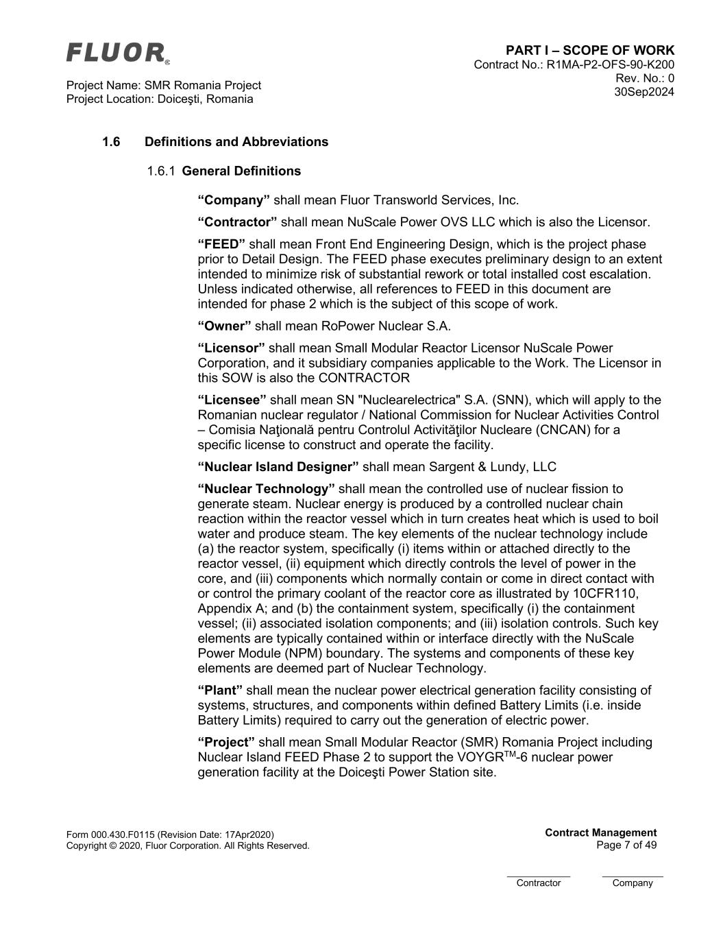 Project Name: SMR Romania Project Project Location: , Romania PART I – SCOPE OF WORK Contract No.: R1MA-P2-OFS-90-K200 Rev. No.: 0 30Sep2024 Form 000.430.F0115 (Revision Date: 17Apr2020) Copyright © 2020, Fluor Corporation. All Rights Reserved. Contract Management Page 7 of 49 Contractor Company 1.6 Definitions and Abbreviations 1.6.1 General Definitions “Company” shall mean Fluor Transworld Services, Inc. “Contractor” shall mean NuScale Power OVS LLC which is also the Licensor. “FEED” shall mean Front End Engineering Design, which is the project phase prior to Detail Design. The FEED phase executes preliminary design to an extent intended to minimize risk of substantial rework or total installed cost escalation. Unless indicated otherwise, all references to FEED in this document are intended for phase 2 which is the subject of this scope of work. “Owner” shall mean RoPower Nuclear S.A. “Licensor” shall mean Small Modular Reactor Licensor NuScale Power Corporation, and it subsidiary companies applicable to the Work. The Licensor in this SOW is also the CONTRACTOR “Licensee” shall mean SN "Nuclearelectrica" S.A. (SNN), which will apply to the Romanian nuclear regulator / National Commission for Nuclear Activities Control – for a specific license to construct and operate the facility. “Nuclear Island Designer” shall mean Sargent & Lundy, LLC “Nuclear Technology” shall mean the controlled use of nuclear fission to generate steam. Nuclear energy is produced by a controlled nuclear chain reaction within the reactor vessel which in turn creates heat which is used to boil water and produce steam. The key elements of the nuclear technology include (a) the reactor system, specifically (i) items within or attached directly to the reactor vessel, (ii) equipment which directly controls the level of power in the core, and (iii) components which normally contain or come in direct contact with or control the primary coolant of the reactor core as illustrated by 10CFR110, Appendix A; and (b) the containment system, specifically (i) the containment vessel; (ii) associated isolation components; and (iii) isolation controls. Such key elements are typically contained within or interface directly with the NuScale Power Module (NPM) boundary. The systems and components of these key elements are deemed part of Nuclear Technology. “Plant” shall mean the nuclear power electrical generation facility consisting of systems, structures, and components within defined Battery Limits (i.e. inside Battery Limits) required to carry out the generation of electric power. “Project” shall mean Small Modular Reactor (SMR) Romania Project including Nuclear Island FEED Phase 2 to support the VOYGRTM-6 nuclear power