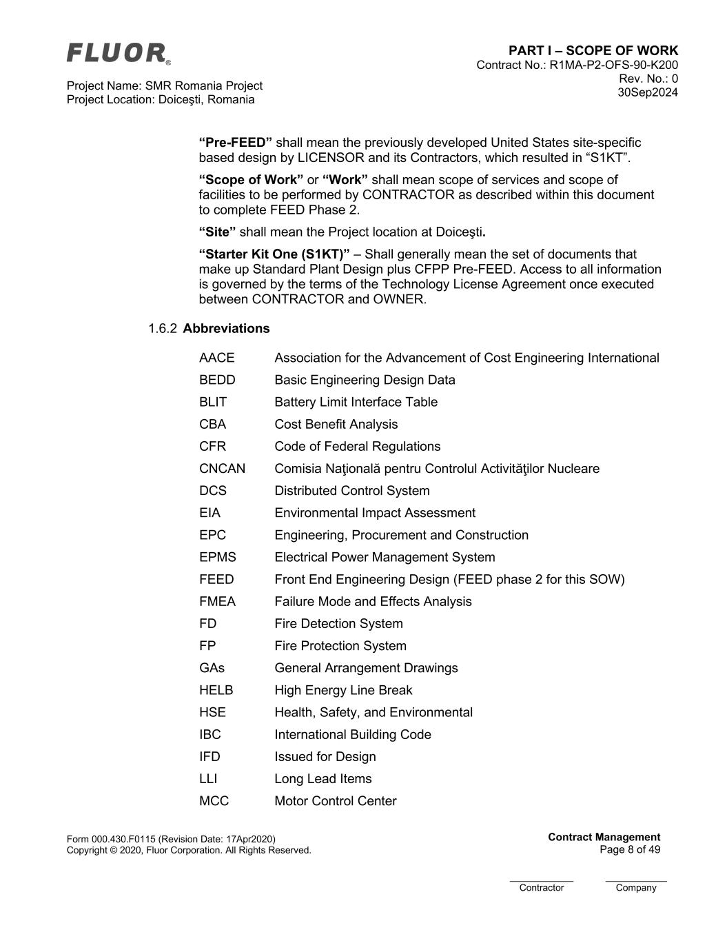 Project Name: SMR Romania Project Project Location: , Romania PART I – SCOPE OF WORK Contract No.: R1MA-P2-OFS-90-K200 Rev. No.: 0 30Sep2024 Form 000.430.F0115 (Revision Date: 17Apr2020) Copyright © 2020, Fluor Corporation. All Rights Reserved. Contract Management Page 8 of 49 Contractor Company “Pre-FEED” shall mean the previously developed United States site-specific based design by LICENSOR and its Contractors, which resulted in “S1KT”. “Scope of Work” or “Work” shall mean scope of services and scope of facilities to be performed by CONTRACTOR as described within this document to complete FEED Phase 2. “Site” shall mean the Project location at . “Starter Kit One (S1KT)” – Shall generally mean the set of documents that make up Standard Plant Design plus CFPP Pre-FEED. Access to all information is governed by the terms of the Technology License Agreement once executed between CONTRACTOR and OWNER. 1.6.2 Abbreviations AACE Association for the Advancement of Cost Engineering International BEDD Basic Engineering Design Data BLIT Battery Limit Interface Table CBA Cost Benefit Analysis CFR Code of Federal Regulations CNCAN DCS Distributed Control System EIA Environmental Impact Assessment EPC Engineering, Procurement and Construction EPMS Electrical Power Management System FEED Front End Engineering Design (FEED phase 2 for this SOW) FMEA Failure Mode and Effects Analysis FD Fire Detection System FP Fire Protection System GAs General Arrangement Drawings HELB High Energy Line Break HSE Health, Safety, and Environmental IBC International Building Code IFD Issued for Design LLI Long Lead Items MCC Motor Control Center