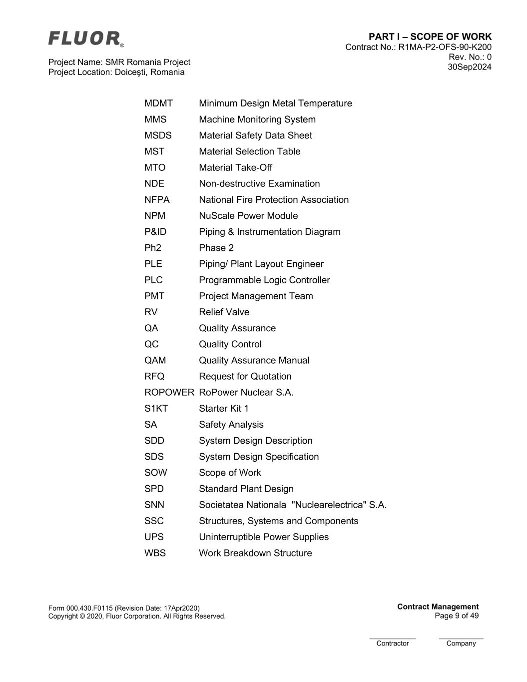 Project Name: SMR Romania Project Project Location: , Romania PART I – SCOPE OF WORK Contract No.: R1MA-P2-OFS-90-K200 Rev. No.: 0 30Sep2024 Form 000.430.F0115 (Revision Date: 17Apr2020) Copyright © 2020, Fluor Corporation. All Rights Reserved. Contract Management Page 9 of 49 Contractor Company MDMT Minimum Design Metal Temperature MMS Machine Monitoring System MSDS Material Safety Data Sheet MST Material Selection Table MTO Material Take-Off NDE Non-destructive Examination NFPA National Fire Protection Association NPM NuScale Power Module P&ID Piping & Instrumentation Diagram Ph2 Phase 2 PLE Piping/ Plant Layout Engineer PLC Programmable Logic Controller PMT Project Management Team RV Relief Valve QA Quality Assurance QC Quality Control QAM Quality Assurance Manual RFQ Request for Quotation ROPOWER RoPower Nuclear S.A. S1KT Starter Kit 1 SA Safety Analysis SDD System Design Description SDS System Design Specification SOW Scope of Work SPD Standard Plant Design SNN Societatea Nationala "Nuclearelectrica" S.A. SSC Structures, Systems and Components UPS Uninterruptible Power Supplies WBS Work Breakdown Structure