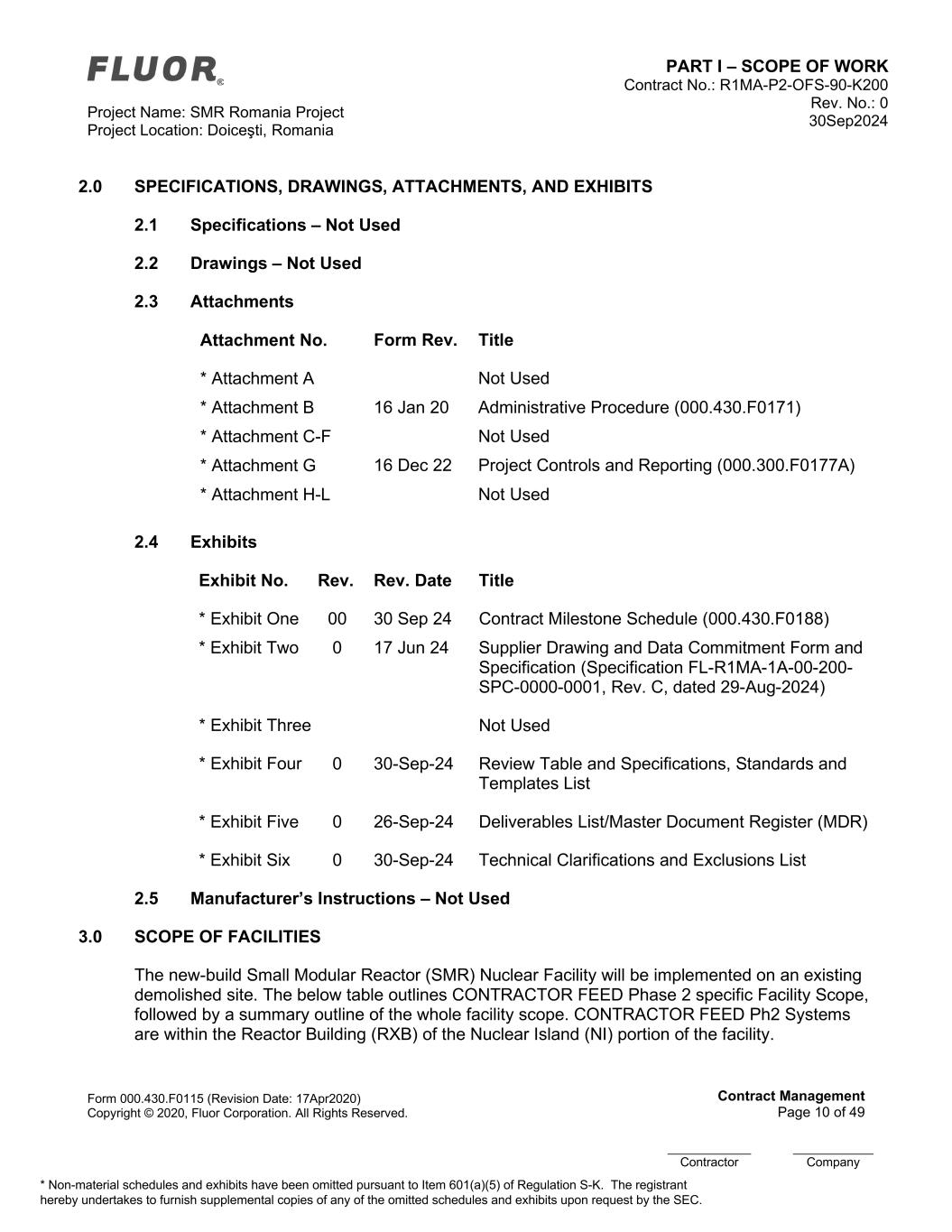 Project Name: SMR Romania Project Project Location: , Romania PART I – SCOPE OF WORK Contract No.: R1MA-P2-OFS-90-K200 Rev. No.: 0 30Sep2024 Form 000.430.F0115 (Revision Date: 17Apr2020) Copyright © 2020, Fluor Corporation. All Rights Reserved. Contract Management Page 10 of 49 Contractor Company 2.0 SPECIFICATIONS, DRAWINGS, ATTACHMENTS, AND EXHIBITS 2.1 Specifications – Not Used 2.2 Drawings – Not Used 2.3 Attachments Form Rev. Title Not Used 16 Jan 20 Administrative Procedure (000.430.F0171) Not Used 16 Dec 22 Project Controls and Reporting (000.300.F0177A) Attachment No. * Attachment A * Attachment B * Attachment C-F * Attachment G * Attachment H-L Not Used 2.4 Exhibits Exhibit No. Rev. Rev. Date Title * Exhibit One 00 30 Sep 24 Contract Milestone Schedule (000.430.F0188) * Exhibit Two 0 17 Jun 24 Supplier Drawing and Data Commitment Form and Specification (Specification FL-R1MA-1A-00-200- SPC-0000-0001, Rev. C, dated 29-Aug-2024) Not Used* Exhibit Three * Exhibit Four 0 30-Sep-24 Review Table and Specifications, Standards and Templates List * Exhibit Five 0 26-Sep-24 Deliverables List/Master Document Register (MDR) * Exhibit Six 0 30-Sep-24 Technical Clarifications and Exclusions List 2.5 Manufacturer’s Instructions – Not Used 3.0 SCOPE OF FACILITIES The new-build Small Modular Reactor (SMR) Nuclear Facility will be implemented on an existing demolished site. The below table outlines CONTRACTOR FEED Phase 2 specific Facility Scope, followed by a summary outline of the whole facility scope. CONTRACTOR FEED Ph2 Systems are within the Reactor Building (RXB) of the Nuclear Island (NI) portion of the facility. * Non-material schedules and exhibits have been omitted pursuant to Item 601(a)(5) of Regulation S-K. The registrant hereby undertakes to furnish supplemental copies of any of the omitted schedules and exhibits upon request by the SEC.
