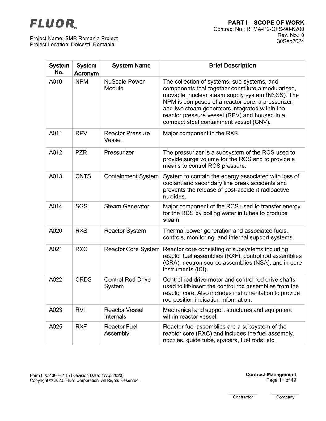 Project Name: SMR Romania Project Project Location: , Romania PART I – SCOPE OF WORK Contract No.: R1MA-P2-OFS-90-K200 Rev. No.: 0 30Sep2024 Form 000.430.F0115 (Revision Date: 17Apr2020) Copyright © 2020, Fluor Corporation. All Rights Reserved. Contract Management Page 11 of 49 Contractor Company System No. System Acronym System Name Brief Description A010 NPM NuScale Power Module The collection of systems, sub-systems, and components that together constitute a modularized, movable, nuclear steam supply system (NSSS). The NPM is composed of a reactor core, a pressurizer, and two steam generators integrated within the reactor pressure vessel (RPV) and housed in a compact steel containment vessel (CNV). A011 RPV Reactor Pressure Vessel Major component in the RXS. A012 PZR Pressurizer The pressurizer is a subsystem of the RCS used to provide surge volume for the RCS and to provide a means to control RCS pressure. A013 CNTS Containment System System to contain the energy associated with loss of coolant and secondary line break accidents and prevents the release of post-accident radioactive nuclides. A014 SGS Steam Generator Major component of the RCS used to transfer energy for the RCS by boiling water in tubes to produce steam. A020 RXS Reactor System Thermal power generation and associated fuels, controls, monitoring, and internal support systems. A021 RXC Reactor Core System Reactor core consisting of subsystems including reactor fuel assemblies (RXF), control rod assemblies (CRA), neutron source assemblies (NSA), and in-core instruments (ICI). A022 CRDS Control Rod Drive System Control rod drive motor and control rod drive shafts used to lift/insert the control rod assemblies from the reactor core. Also includes instrumentation to provide rod position indication information. A023 RVI Reactor Vessel Internals Mechanical and support structures and equipment within reactor vessel. A025 RXF Reactor Fuel Assembly Reactor fuel assemblies are a subsystem of the reactor core (RXC) and includes the fuel assembly, nozzles, guide tube, spacers, fuel rods, etc.