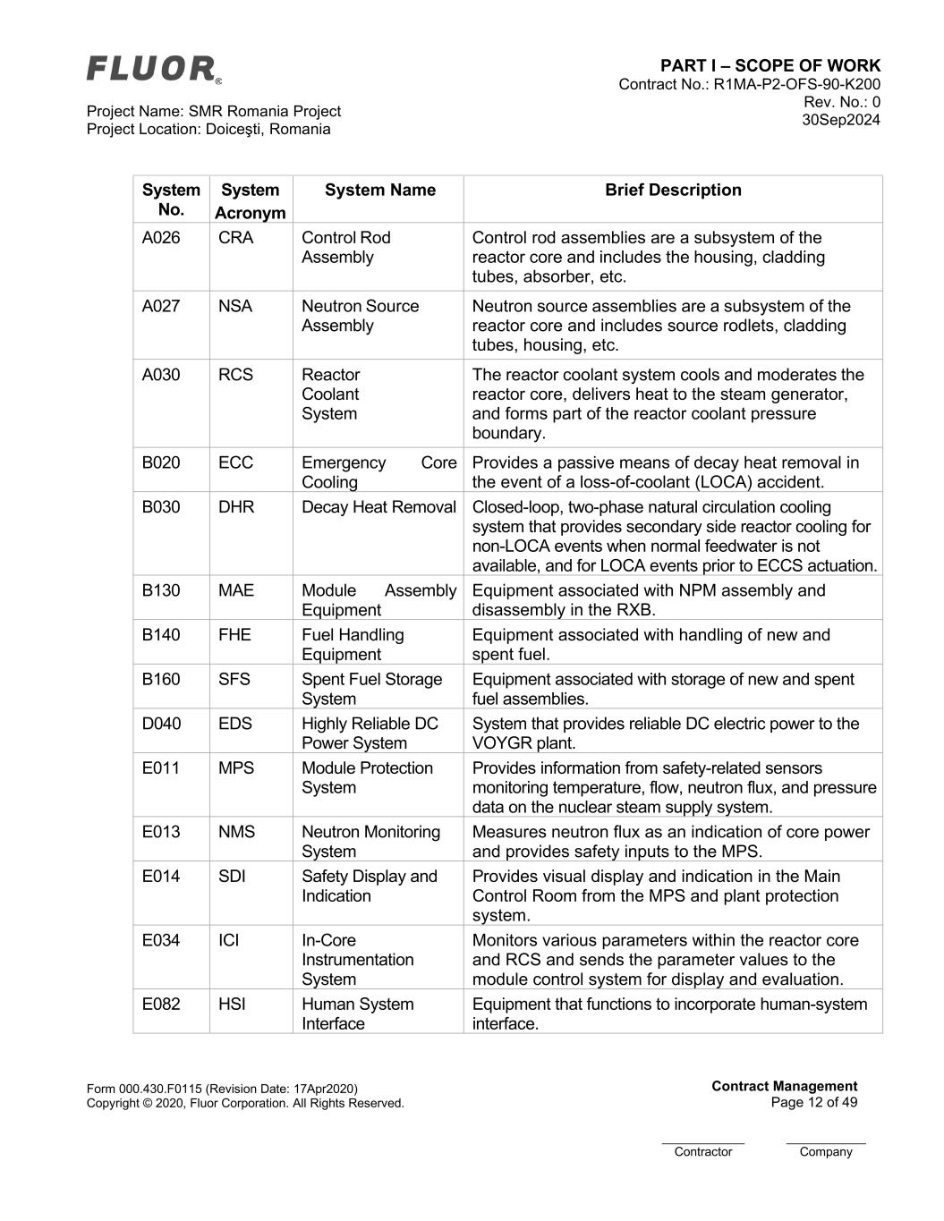 Project Name: SMR Romania Project Project Location: , Romania PART I – SCOPE OF WORK Contract No.: R1MA-P2-OFS-90-K200 Rev. No.: 0 30Sep2024 Form 000.430.F0115 (Revision Date: 17Apr2020) Copyright © 2020, Fluor Corporation. All Rights Reserved. Contract Management Page 12 of 49 Contractor Company System No. System Acronym System Name Brief Description A026 CRA Control Rod Assembly Control rod assemblies are a subsystem of the reactor core and includes the housing, cladding tubes, absorber, etc. A027 NSA Neutron Source Assembly Neutron source assemblies are a subsystem of the reactor core and includes source rodlets, cladding tubes, housing, etc. A030 RCS Reactor Coolant System The reactor coolant system cools and moderates the reactor core, delivers heat to the steam generator, and forms part of the reactor coolant pressure boundary. B020 ECC Emergency Core Cooling Provides a passive means of decay heat removal in the event of a loss-of-coolant (LOCA) accident. B030 DHR Decay Heat Removal Closed-loop, two-phase natural circulation cooling system that provides secondary side reactor cooling for non-LOCA events when normal feedwater is not available, and for LOCA events prior to ECCS actuation. B130 MAE Module Assembly Equipment Equipment associated with NPM assembly and disassembly in the RXB. B140 FHE Fuel Handling Equipment Equipment associated with handling of new and spent fuel. B160 SFS Spent Fuel Storage System Equipment associated with storage of new and spent fuel assemblies. D040 EDS Highly Reliable DC Power System System that provides reliable DC electric power to the VOYGR plant. E011 MPS Module Protection System Provides information from safety-related sensors monitoring temperature, flow, neutron flux, and pressure data on the nuclear steam supply system. E013 NMS Neutron Monitoring System Measures neutron flux as an indication of core power and provides safety inputs to the MPS. E014 SDI Safety Display and Indication Provides visual display and indication in the Main Control Room from the MPS and plant protection system. E034 ICI In-Core Instrumentation System Monitors various parameters within the reactor core and RCS and sends the parameter values to the module control system for display and evaluation. E082 HSI Human System Interface Equipment that functions to incorporate human-system interface.