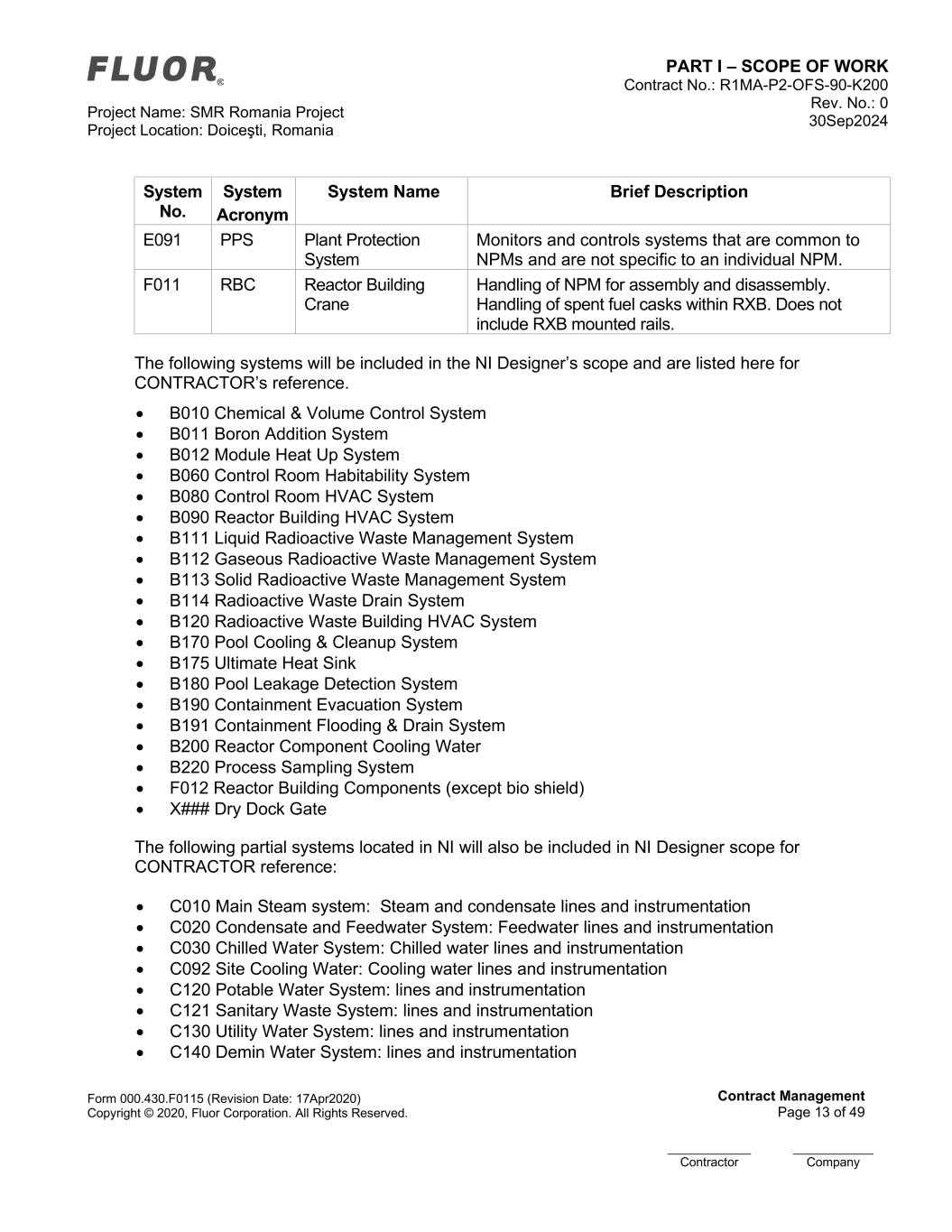 Project Name: SMR Romania Project Project Location: , Romania PART I – SCOPE OF WORK Contract No.: R1MA-P2-OFS-90-K200 Rev. No.: 0 30Sep2024 Form 000.430.F0115 (Revision Date: 17Apr2020) Copyright © 2020, Fluor Corporation. All Rights Reserved. Contract Management Page 13 of 49 Contractor Company System No. System Acronym System Name Brief Description E091 PPS Plant Protection System Monitors and controls systems that are common to NPMs and are not specific to an individual NPM. F011 RBC Reactor Building Crane Handling of NPM for assembly and disassembly. Handling of spent fuel casks within RXB. Does not include RXB mounted rails. The following systems will be included in the NI Designer’s scope and are listed here for CONTRACTOR’s reference. B010 Chemical & Volume Control System B011 Boron Addition System B012 Module Heat Up System B060 Control Room Habitability System B080 Control Room HVAC System B090 Reactor Building HVAC System B111 Liquid Radioactive Waste Management System B112 Gaseous Radioactive Waste Management System B113 Solid Radioactive Waste Management System B114 Radioactive Waste Drain System B120 Radioactive Waste Building HVAC System B170 Pool Cooling & Cleanup System B175 Ultimate Heat Sink B180 Pool Leakage Detection System B190 Containment Evacuation System B191 Containment Flooding & Drain System B200 Reactor Component Cooling Water B220 Process Sampling System F012 Reactor Building Components (except bio shield) X### Dry Dock Gate The following partial systems located in NI will also be included in NI Designer scope for CONTRACTOR reference: C010 Main Steam system: Steam and condensate lines and instrumentation C020 Condensate and Feedwater System: Feedwater lines and instrumentation C030 Chilled Water System: Chilled water lines and instrumentation C092 Site Cooling Water: Cooling water lines and instrumentation C120 Potable Water System: lines and instrumentation C121 Sanitary Waste System: lines and instrumentation C130 Utility Water System: lines and instrumentation C140 Demin Water System: lines and instrumentation