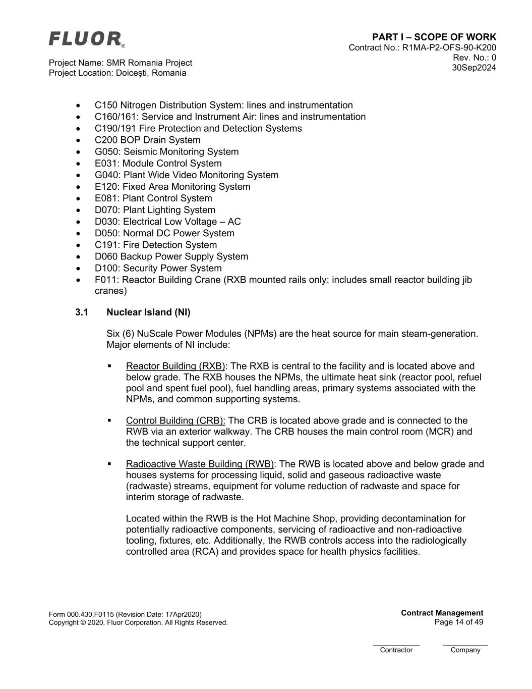 Project Name: SMR Romania Project Project Location: , Romania PART I – SCOPE OF WORK Contract No.: R1MA-P2-OFS-90-K200 Rev. No.: 0 30Sep2024 Form 000.430.F0115 (Revision Date: 17Apr2020) Copyright © 2020, Fluor Corporation. All Rights Reserved. Contract Management Page 14 of 49 Contractor Company C150 Nitrogen Distribution System: lines and instrumentation C160/161: Service and Instrument Air: lines and instrumentation C190/191 Fire Protection and Detection Systems C200 BOP Drain System G050: Seismic Monitoring System E031: Module Control System G040: Plant Wide Video Monitoring System E120: Fixed Area Monitoring System E081: Plant Control System D070: Plant Lighting System D030: Electrical Low Voltage – AC D050: Normal DC Power System C191: Fire Detection System D060 Backup Power Supply System D100: Security Power System F011: Reactor Building Crane (RXB mounted rails only; includes small reactor building jib cranes) 3.1 Nuclear Island (NI) Six (6) NuScale Power Modules (NPMs) are the heat source for main steam-generation. Major elements of NI include: Reactor Building (RXB): The RXB is central to the facility and is located above and below grade. The RXB houses the NPMs, the ultimate heat sink (reactor pool, refuel pool and spent fuel pool), fuel handling areas, primary systems associated with the NPMs, and common supporting systems. Control Building (CRB): The CRB is located above grade and is connected to the RWB via an exterior walkway. The CRB houses the main control room (MCR) and the technical support center. Radioactive Waste Building (RWB): The RWB is located above and below grade and houses systems for processing liquid, solid and gaseous radioactive waste (radwaste) streams, equipment for volume reduction of radwaste and space for interim storage of radwaste. Located within the RWB is the Hot Machine Shop, providing decontamination for potentially radioactive components, servicing of radioactive and non-radioactive tooling, fixtures, etc. Additionally, the RWB controls access into the radiologically controlled area (RCA) and provides space for health physics facilities.