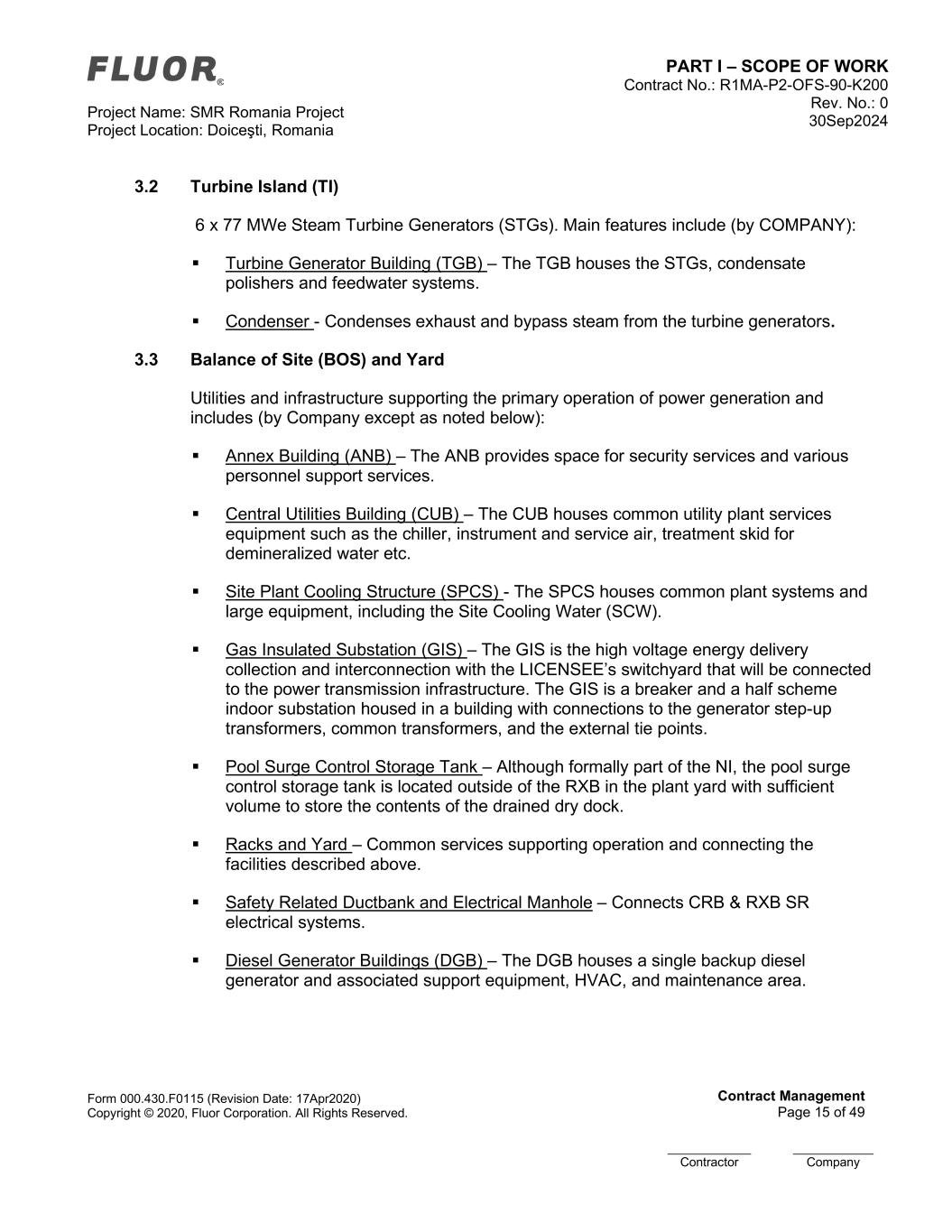 Project Name: SMR Romania Project Project Location: , Romania PART I – SCOPE OF WORK Contract No.: R1MA-P2-OFS-90-K200 Rev. No.: 0 30Sep2024 Form 000.430.F0115 (Revision Date: 17Apr2020) Copyright © 2020, Fluor Corporation. All Rights Reserved. Contract Management Page 15 of 49 Contractor Company 3.2 Turbine Island (TI) 6 x 77 MWe Steam Turbine Generators (STGs). Main features include (by COMPANY): Turbine Generator Building (TGB) – The TGB houses the STGs, condensate polishers and feedwater systems. Condenser - Condenses exhaust and bypass steam from the turbine generators. 3.3 Balance of Site (BOS) and Yard Utilities and infrastructure supporting the primary operation of power generation and includes (by Company except as noted below): Annex Building (ANB) – The ANB provides space for security services and various personnel support services. Central Utilities Building (CUB) – The CUB houses common utility plant services equipment such as the chiller, instrument and service air, treatment skid for demineralized water etc. Site Plant Cooling Structure (SPCS) - The SPCS houses common plant systems and large equipment, including the Site Cooling Water (SCW). Gas Insulated Substation (GIS) – The GIS is the high voltage energy delivery collection and interconnection with the LICENSEE’s switchyard that will be connected to the power transmission infrastructure. The GIS is a breaker and a half scheme indoor substation housed in a building with connections to the generator step-up transformers, common transformers, and the external tie points. Pool Surge Control Storage Tank – Although formally part of the NI, the pool surge control storage tank is located outside of the RXB in the plant yard with sufficient volume to store the contents of the drained dry dock. Racks and Yard – Common services supporting operation and connecting the facilities described above. Safety Related Ductbank and Electrical Manhole – Connects CRB & RXB SR electrical systems. Diesel Generator Buildings (DGB) – The DGB houses a single backup diesel generator and associated support equipment, HVAC, and maintenance area.
