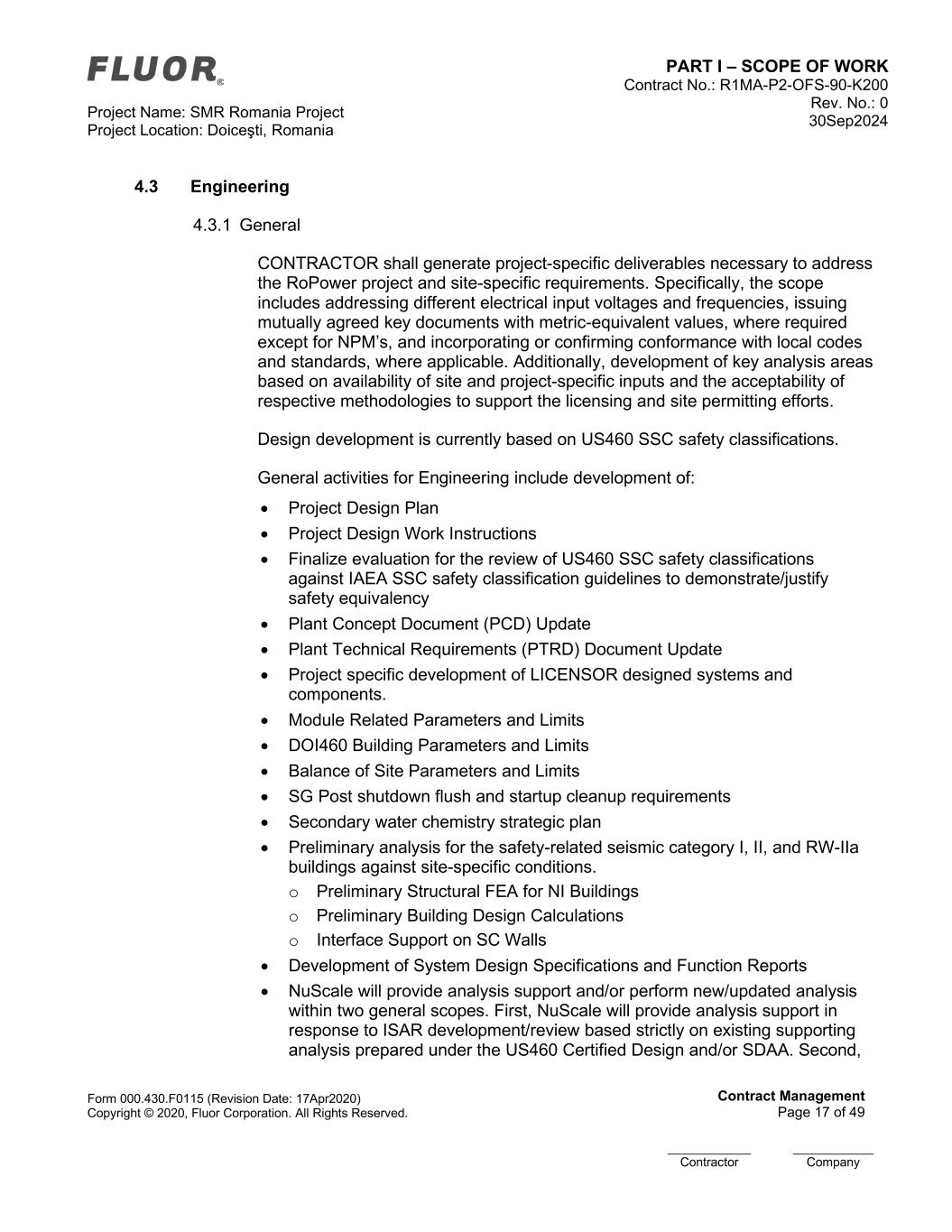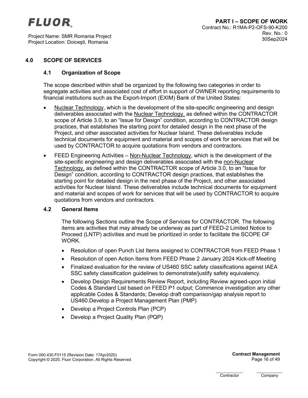 Project Name: SMR Romania Project Project Location: , Romania PART I – SCOPE OF WORK Contract No.: R1MA-P2-OFS-90-K200 Rev. No.: 0 30Sep2024 Form 000.430.F0115 (Revision Date: 17Apr2020) Copyright © 2020, Fluor Corporation. All Rights Reserved. Contract Management Page 16 of 49 Contractor Company 4.0 SCOPE OF SERVICES 4.1 Organization of Scope The scope described within shall be organized by the following two categories in order to segregate activities and associated cost of effort in support of OWNER reporting requirements to financial institutions such as the Export-Import (EXIM) Bank of the United States: Nuclear Technology, which is the development of the site-specific engineering and design deliverables associated with the Nuclear Technology, as defined within the CONTRACTOR scope of Article 3.0, to an “Issue for Design” condition, according to CONTRACTOR design practices, that establishes the starting point for detailed design in the next phase of the Project, and other associated activities for Nuclear Island. These deliverables include technical documents for equipment and material and scopes of work for services that will be used by CONTRACTOR to acquire quotations from vendors and contractors. FEED Engineering Activities – Non-Nuclear Technology, which is the development of the site-specific engineering and design deliverables associated with the non-Nuclear Technology, as defined within the CONTRACTOR scope of Article 3.0, to an “Issue for Design” condition, according to CONTRACTOR design practices, that establishes the starting point for detailed design in the next phase of the Project, and other associated activities for Nuclear Island. These deliverables include technical documents for equipment and material and scopes of work for services that will be used by CONTRACTOR to acquire quotations from vendors and contractors. 4.2 General Items The following Sections outline the Scope of Services for CONTRACTOR. The following items are activities that may already be underway as part of FEED-2 Limited Notice to Proceed (LNTP) activities and must be prioritized in order to facilitate the SCOPE OF WORK. Resolution of open Punch List Items assigned to CONTRACTOR from FEED Phase 1 Resolution of open Action Items from FEED Phase 2 January 2024 Kick-off Meeting Finalized evaluation for the review of US460 SSC safety classifications against IAEA SSC safety classification guidelines to demonstrate/justify safety equivalency. Develop Design Requirements Review Report, including Review agreed-upon initial Codes & Standard List based on FEED P1 output; Commence investigation any other applicable Codes & Standards; Develop draft comparison/gap analysis report to US460.Develop a Project Management Plan (PMP) Develop a Project Controls Plan (PCP) Develop a Project Quality Plan (PQP)