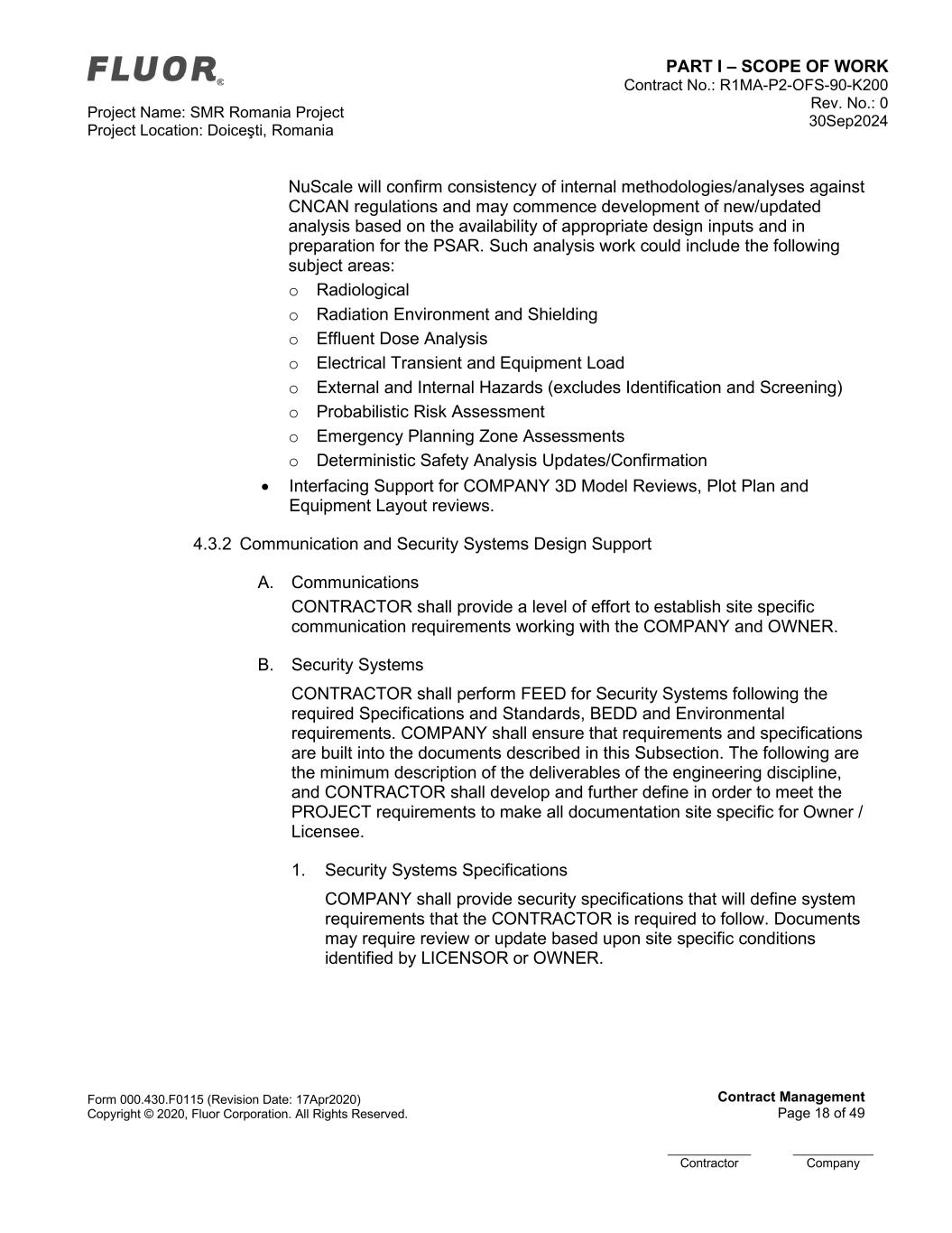 Project Name: SMR Romania Project Project Location: , Romania PART I – SCOPE OF WORK Contract No.: R1MA-P2-OFS-90-K200 Rev. No.: 0 30Sep2024 Form 000.430.F0115 (Revision Date: 17Apr2020) Copyright © 2020, Fluor Corporation. All Rights Reserved. Contract Management Page 18 of 49 Contractor Company NuScale will confirm consistency of internal methodologies/analyses against CNCAN regulations and may commence development of new/updated analysis based on the availability of appropriate design inputs and in preparation for the PSAR. Such analysis work could include the following subject areas: o Radiological o Radiation Environment and Shielding o Effluent Dose Analysis o Electrical Transient and Equipment Load o External and Internal Hazards (excludes Identification and Screening) o Probabilistic Risk Assessment o Emergency Planning Zone Assessments o Deterministic Safety Analysis Updates/Confirmation Interfacing Support for COMPANY 3D Model Reviews, Plot Plan and Equipment Layout reviews. 4.3.2 Communication and Security Systems Design Support A. Communications CONTRACTOR shall provide a level of effort to establish site specific communication requirements working with the COMPANY and OWNER. B. Security Systems CONTRACTOR shall perform FEED for Security Systems following the required Specifications and Standards, BEDD and Environmental requirements. COMPANY shall ensure that requirements and specifications are built into the documents described in this Subsection. The following are the minimum description of the deliverables of the engineering discipline, and CONTRACTOR shall develop and further define in order to meet the PROJECT requirements to make all documentation site specific for Owner / Licensee. 1. Security Systems Specifications COMPANY shall provide security specifications that will define system requirements that the CONTRACTOR is required to follow. Documents may require review or update based upon site specific conditions identified by LICENSOR or OWNER.