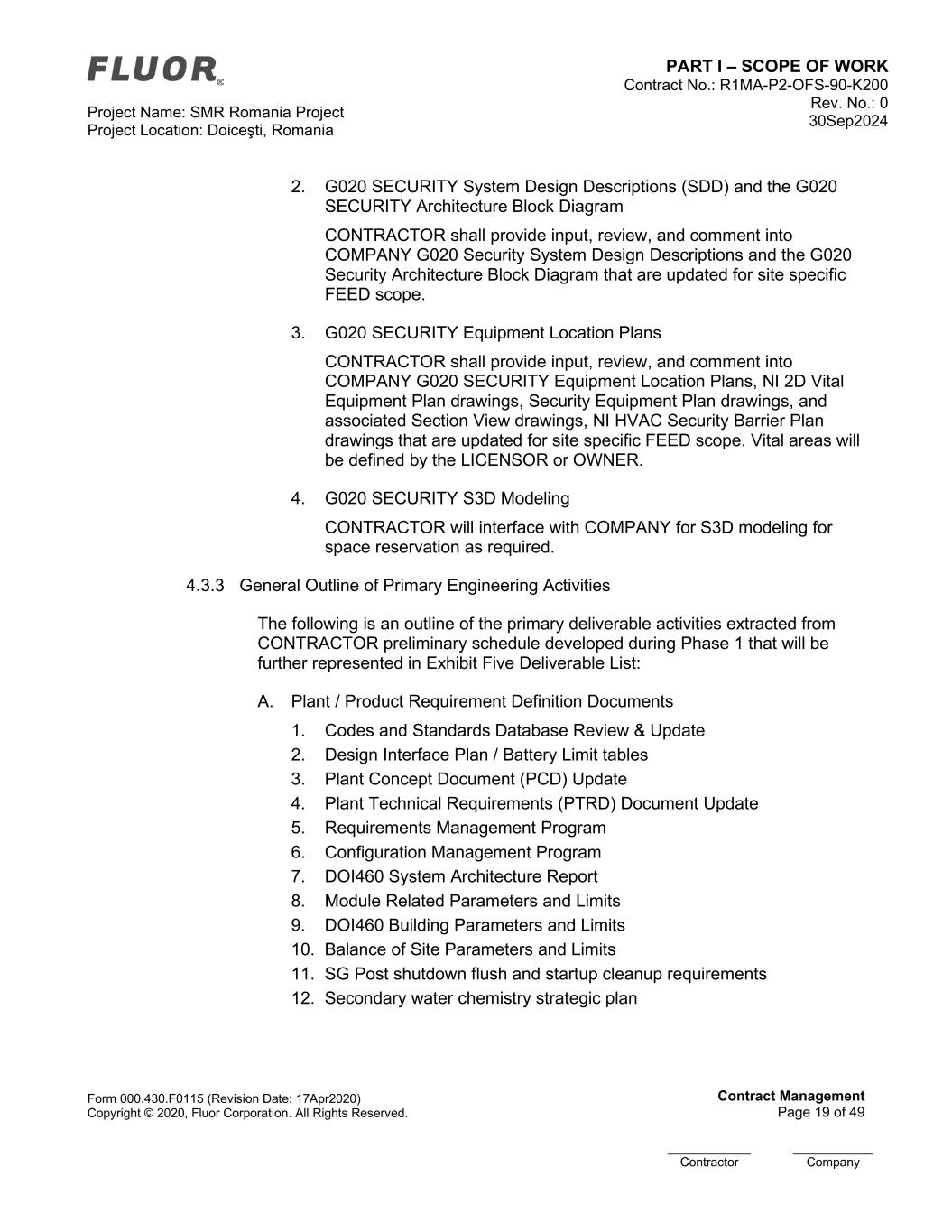 Project Name: SMR Romania Project Project Location: , Romania PART I – SCOPE OF WORK Contract No.: R1MA-P2-OFS-90-K200 Rev. No.: 0 30Sep2024 Form 000.430.F0115 (Revision Date: 17Apr2020) Copyright © 2020, Fluor Corporation. All Rights Reserved. Contract Management Page 19 of 49 Contractor Company 2. G020 SECURITY System Design Descriptions (SDD) and the G020 SECURITY Architecture Block Diagram CONTRACTOR shall provide input, review, and comment into COMPANY G020 Security System Design Descriptions and the G020 Security Architecture Block Diagram that are updated for site specific FEED scope. 3. G020 SECURITY Equipment Location Plans CONTRACTOR shall provide input, review, and comment into COMPANY G020 SECURITY Equipment Location Plans, NI 2D Vital Equipment Plan drawings, Security Equipment Plan drawings, and associated Section View drawings, NI HVAC Security Barrier Plan drawings that are updated for site specific FEED scope. Vital areas will be defined by the LICENSOR or OWNER. 4. G020 SECURITY S3D Modeling CONTRACTOR will interface with COMPANY for S3D modeling for space reservation as required. 4.3.3 General Outline of Primary Engineering Activities The following is an outline of the primary deliverable activities extracted from CONTRACTOR preliminary schedule developed during Phase 1 that will be further represented in Exhibit Five Deliverable List: A. Plant / Product Requirement Definition Documents 1. Codes and Standards Database Review & Update 2. Design Interface Plan / Battery Limit tables 3. Plant Concept Document (PCD) Update 4. Plant Technical Requirements (PTRD) Document Update 5. Requirements Management Program 6. Configuration Management Program 7. DOI460 System Architecture Report 8. Module Related Parameters and Limits 9. DOI460 Building Parameters and Limits 10. Balance of Site Parameters and Limits 11. SG Post shutdown flush and startup cleanup requirements 12. Secondary water chemistry strategic plan