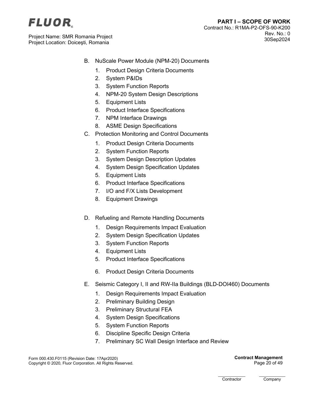 Project Name: SMR Romania Project Project Location: , Romania PART I – SCOPE OF WORK Contract No.: R1MA-P2-OFS-90-K200 Rev. No.: 0 30Sep2024 Form 000.430.F0115 (Revision Date: 17Apr2020) Copyright © 2020, Fluor Corporation. All Rights Reserved. Contract Management Page 20 of 49 Contractor Company B. NuScale Power Module (NPM-20) Documents 1. Product Design Criteria Documents 2. System P&IDs 3. System Function Reports 4. NPM-20 System Design Descriptions 5. Equipment Lists 6. Product Interface Specifications 7. NPM Interface Drawings 8. ASME Design Specifications C. Protection Monitoring and Control Documents 1. Product Design Criteria Documents 2. System Function Reports 3. System Design Description Updates 4. System Design Specification Updates 5. Equipment Lists 6. Product Interface Specifications 7. I/O and F/X Lists Development 8. Equipment Drawings D. Refueling and Remote Handling Documents 1. Design Requirements Impact Evaluation 2. System Design Specification Updates 3. System Function Reports 4. Equipment Lists 5. Product Interface Specifications 6. Product Design Criteria Documents E. Seismic Category I, II and RW-IIa Buildings (BLD-DOI460) Documents 1. Design Requirements Impact Evaluation 2. Preliminary Building Design 3. Preliminary Structural FEA 4. System Design Specifications 5. System Function Reports 6. Discipline Specific Design Criteria 7. Preliminary SC Wall Design Interface and Review